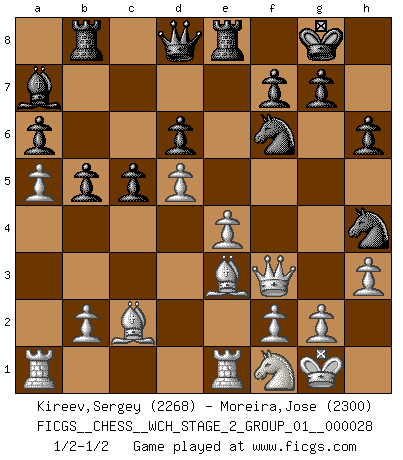 Last move : 1/2-1/2 2024 November 30 18:56:33 [Event "FICGS__CHESS__WCH_STAGE_2_GROUP_01__000028"] [Site "FICGS"] [Date "2024.11.25"] [Round "1"] [White "Kireev,Sergey"] [Black "Moreira,Jose"] [Result "1/2-1/2"] [WhiteElo "2268"] [BlackElo "2300"] 1.e4 e5 2.Nf3 Nc6 3.Bb5 a6 4.Ba4 Nf6 5.d3 Bc5 6.O-O b5 7.Bb3 d6 8.c3 O-O 9.Nbd2 Bb6 10.Re1 Ne7 11.Nf1 h6 12.a4 Rb8 13.d4 exd4 14.cxd4 Bg4 15.a5 Ba7 16.Bc2 Re8 17.Be3 c5 18.d5 Ng6 19.h3 Bxf3 20.Qxf3 Nh4 21.Qf4 Ng6 22.Qf3 Nh4 1/2-1/2 Follow this game move after move (download)Blessed be the memory of him who gave the world this immortal game. (A. G. Gardiner) Smyslow ist ein Beweis dafür, dass ich noch zehn Jahre spielen kann! [der 75 jährige über den 85 jährigen] (Viktor Kortschnoi) El juego de Fischer siempre fue nítido, racional y brillante. Uno de los mejores por siempre. (Dave Regis) Shah mat. Le roi est mort. Cri de fierté d'un joueur venant de terrasser son adversaire, courtoisement, sans effusion de sang. There is a great deal of difference between an eager man who wants to read a book and a tired man who wants a book to read. (G.K. Chesterton)
