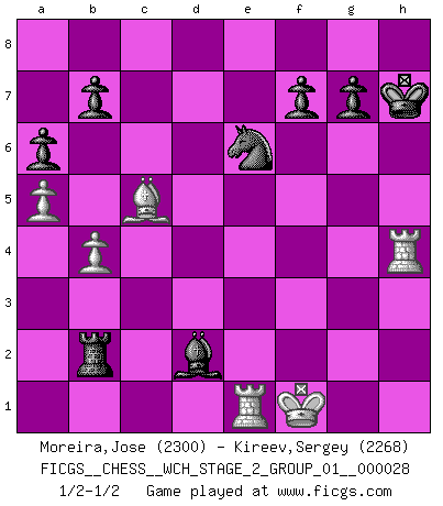Last move : 1/2-1/2 2024 December 6 19:26:24 [Event "FICGS__CHESS__WCH_STAGE_2_GROUP_01__000028"] [Site "FICGS"] [Date "2024.11.25"] [Round "2"] [White "Moreira,Jose"] [Black "Kireev,Sergey"] [Result "1/2-1/2"] [WhiteElo "2300"] [BlackElo "2268"] 1.e4 c5 2.Nf3 d6 3.d4 cxd4 4.Nxd4 Nf6 5.Nc3 a6 6.f3 e5 7.Nb3 Be6 8.Be3 h5 9.Be2 Nbd7 10.a4 Be7 11.Qd2 Qc7 12.O-O O-O 13.Rfc1 Nb6 14.a5 Nc4 15.Bxc4 Bxc4 16.Na4 d5 17.Nb6 dxe4 18.Qc3 Rac8 19.Nxc8 Rxc8 20.Nd2 Nd5 21.Qxc4 Qxc4 22.Nxc4 Rxc4 23.Ba7 exf3 24.gxf3 Bg5 25.Re1 Rxc2 26.Rxe5 Nf4 27.b4 Nh3+ 28.Kf1 Rxh2 29.Rae1 Rb2 30.Bc5 h4 31.f4 Bxf4 32.Rh5 Bh6 33.Rxh4 Nf4 34.Bd6 Nd5 35.Bc5 Nf4 36.Re4 Rb1+ 37.Kf2 Ne6 38.Re1 Rb2+ 39.Re2 Rb1 40.Rc4 Kh7 41.Re1 Rb2+ 42.Kf1 Bd2 43.Rh4+ Bh6 44.Rc4 Bd2 45.Rh4+ 1/2-1/2 Follow this game move after move (download)My opponents make good moves too. Sometimes I don't take these things into consideration. (Bobby Fischer) Es ist im Leben wie im Schachspiel. Wir entwerfen einen Plan, dieser bleibt jedoch bedingt durch das, was im Schachspiel dem Gegner, im Leben dem Schicksal zu tun belieben wird. (Arthur Schopenhauer) El Ajedrez es la vida. (Bobby Fischer) La vie est comme un jeu d'échecs : nous esquissons un plan, mais celui-ci est tributaire de ce que daignent faire l'adversaire aux échecs et le destin dans la vie. (Arthur Schopenhauer) If you don't practice you don't deserve to win. (Andre Agassi)
