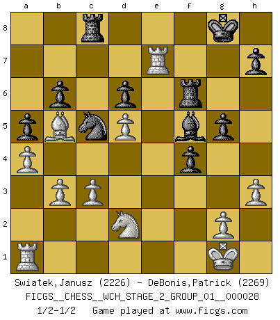 Last move : 1/2-1/2 2025 April 1 23:16:34 [Event "FICGS__CHESS__WCH_STAGE_2_GROUP_01__000028"] [Site "FICGS"] [Date "2024.11.25"] [Round "1"] [White "Swiatek,Janusz"] [Black "DeBonis,Patrick"] [Result "1/2-1/2"] [WhiteElo "2226"] [BlackElo "2269"] 1.e4 c5 2.Nf3 Nc6 3.d4 cxd4 4.Nxd4 Nf6 5.Nc3 e5 6.Ndb5 d6 7.Nd5 Nxd5 8.exd5 Nb8 9.a4 Be7 10.Be2 O-O 11.O-O f5 12.f4 a6 13.Na3 Nd7 14.Nc4 a5 15.b3 exf4 16.Bxf4 Nc5 17.Re1 g5 18.Be3 Bf6 19.Rc1 Bc3 20.Bd4 Bxd4+ 21.Qxd4 b6 22.Nd2 Bd7 23.Ra1 f4 24.h3 Bf5 25.c3 Qf6 26.Bb5 Rac8 27.Qxf6 Rxf6 28.Re7 1/2-1/2 Follow this game move after move (download)Chess demands total concentration. (Bobby Fischer) Offener Brief an US-Präsident Bush anlässlich der Verhaftung Bobby Fishers: Verhaften Sie mich. Stecken Sie mich in dieselbe Zelle wie Bobby Fisher und geben Sie uns ein Schachspiel mit. (Boris Vassilievich Spassky) Mis oponentes también hacen buenas movidas. A veces yo no tomo esas cosas en consideración. (Bobby Fischer) Toutes les manuvres exécutées sur une colonne ouverte ont pour but ultime l'intrusion définitive sur la septième ou la huitième rangée, en plein cur de la position ennemie. (Aaron Nimzovitch) It is the aim of the modern school, not to treat every position according to one general law, but according to the principle inherent in the position. (Richard Reti)