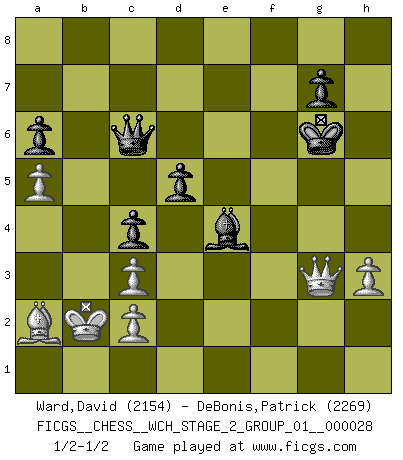 Last move : 1/2-1/2 2025 May 25 22:32:41 [Event "FICGS__CHESS__WCH_STAGE_2_GROUP_01__000028"] [Site "FICGS"] [Date "2024.11.25"] [Round "2"] [White "Ward,David"] [Black "DeBonis,Patrick"] [Result "1/2-1/2"] [WhiteElo "2154"] [BlackElo "2269"] 1.e4 e5 2.Nf3 Nc6 3.Bb5 Nf6 4.Nc3 Nd4 5.Ba4 c6 6.Nxd4 exd4 7.e5 dxc3 8.exf6 Qxf6 9.dxc3 Qe5+ 10.Be3 d5 11.Qd4 Bd6 12.O-O-O b5 13.Bb3 O-O 14.Rhe1 Be6 15.h3 Qh5 16.Qd2 Be7 17.Kb1 Rfe8 18.Bf4 Rad8 19.Re5 Qg6 20.g4 h6 21.a4 a6 22.Rde1 Bd6 23.R5e2 Bxf4 24.Qxf4 c5 25.Ba2 c4 26.Qd4 Kh7 27.a5 f5 28.f3 fxg4 29.fxg4 Bf7 30.Rxe8 Bxe8 31.b3 Rd6 32.Kb2 Bf7 33.Rf1 Rf6 34.Rxf6 Qxf6 35.Qb6 Bg6 36.Bb1 Be4 37.Qb7 h5 38.bxc4 bxc4 39.gxh5 Kh6 40.Ba2 Bf3 41.Qb8 Kxh5 42.Qg3 Kh6 43.Qe1 Kh7 44.Qe8 Qg6 45.Qd8 Be4 46.Qh4+ Qh6 47.Qg4 Qc6 48.Qh4+ Kg6 49.Qg3+ Kf7 50.Qb8 Kg6 51.Qg3+ Kf6 52.Qf4+ Kg6 53.Qg3+ 1/2-1/2 Follow this game move after move (download)Bobby Fischer is the greatest Chess player who has ever lived. (Ken Smith) Im Internet Chess Club betrug mein Rating vorübergehend 3350 ELO-Punkte. (Sergej Karjakin) El Ajedrez es una manera fabulosa para que los niños aprendan a autovalorarse y a autoestimarse. (Saudin Robovic) Même un GMI sait rarement calculer sur plus de cinq coups une attaque à sacrifices. (Rudolf Spielmann) I feel so... helpless. (C-3PO in Star Wars ep.3)