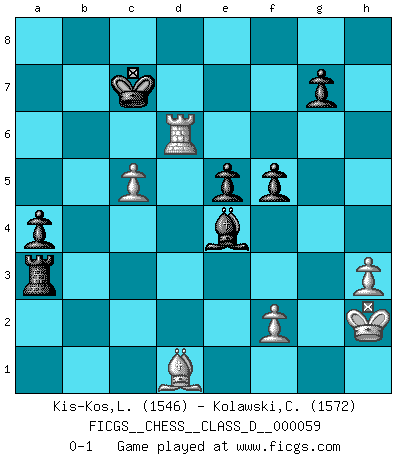 Last move : 0-1 2008 January 12 6:54:28 [Event "FICGS__CHESS__CLASS_D__000059"] [Site "FICGS"] [Date "2007.09.21"] [Round "1"] [White "Kis-Kos,Laszlo"] [Black "Kolawski,Christof"] [Result "0-1"] [WhiteElo "1546"] [BlackElo "1572"] 1.e4 e6 2.d4 d5 3.Nc3 Nf6 4.Bg5 dxe4 5.Nxe4 Nbd7 6.Nxf6+ Nxf6 7.Nf3 h6 8.Bxf6 Qxf6 9.Bb5+ c6 10.Bd3 Bd7 11.c3 Bd6 12.Nd2 c5 13.Ne4 Qe7 14.dxc5 Bxc5 15.Nxc5 Qxc5 16.O-O Bc6 17.Qg4 Qg5 18.Qxg5 hxg5 19.Rad1 Rd8 20.Rd2 g4 21.Rfd1 Ke7 22.Bc2 Rxd2 23.Rxd2 f5 24.c4 b6 25.b4 a5 26.bxa5 bxa5 27.c5 Rb8 28.Re2 Kd7 29.h3 gxh3 30.gxh3 a4 31.a3 Rb2 32.Bd1 Rb1 33.Rd2+ Kc7 34.Kh2 Ra1 35.Rd3 Be4 36.Rd4 e5 37.Rd6 Rxa3 0-1 French : Burn variation Kingside Castling by player White (move 16) Player Black won this chess game. Follow this game move after move (download)Modern Chess is too much concerned with things like Pawn structure. Forget it, Checkmate ends the game. (Nigel Short) Je älter ich werde, um so mehr schätze ich die Bauern. (Paul Keres) El poder defensivo de una pieza clavada, solamente es imaginario. (Aaron Nimzovich) Les Echecs ne sont pas pour les âmes timides. Ils requièrent un homme entier, qui ne s'arrête pas aveuglément à ce qui a été déjà établi, mais qui tente individuellement de sonder les profondeurs du jeu. (W. Steinitz) It is the aim of the modern school, not to treat every position according to one general law, but according to the principle inherent in the position. (Richard Reti)