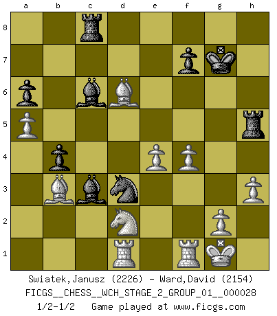 Last move : 1/2-1/2 2025 February 23 1:23:7 [Event "FICGS__CHESS__WCH_STAGE_2_GROUP_01__000028"] [Site "FICGS"] [Date "2024.11.25"] [Round "1"] [White "Swiatek,Janusz"] [Black "Ward,David"] [Result "1/2-1/2"] [WhiteElo "2226"] [BlackElo "2154"] 1.e4 e5 2.Nf3 Nc6 3.Bb5 a6 4.Ba4 Nf6 5.O-O b5 6.Bb3 Bb7 7.Re1 Bc5 8.c3 d6 9.d4 Bb6 10.a4 O-O 11.Bg5 h6 12.Bh4 b4 13.Qd3 g5 14.Nxg5 hxg5 15.Bxg5 Kg7 16.Nd2 exd4 17.a5 Ba7 18.Qg3 Nh5 19.Qg4 Ne5 20.Qxh5 Rh8 21.Bxd8 Rxh5 22.cxd4 Bxd4 23.Bxc7 Nd3 24.Re2 Rc8 25.Bxd6 Nc1 26.Re1 Nd3 27.Re2 Nc1 28.Re1 Nd3 29.Rf1 Bxb2 30.Rad1 Bc3 31.h3 Bc6 32.f4 1/2-1/2 Follow this game move after move (download)Good positions don't win games, good moves do. (Gerald Abrahams) Ein guter Spieler hat immer Glück. (José Raúl Capablanca) Con el tiempo, empecé a progresar en partidas decisivas. Tal vez porque me di cuenta de una simple verdad: no solo estaba yo nervioso sino también mi oponente. (Mikhail Tal) En blitz, le Cavalier l'emporte sur le Fou. (Vlastimil Hort) He who laughs last probably does not get the joke. (Unknown)