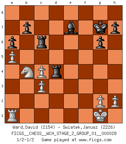 Last move : 1/2-1/2 2025 March 6 1:55:31 [Event "FICGS__CHESS__WCH_STAGE_2_GROUP_01__000028"] [Site "FICGS"] [Date "2024.11.25"] [Round "2"] [White "Ward,David"] [Black "Swiatek,Janusz"] [Result "1/2-1/2"] [WhiteElo "2154"] [BlackElo "2226"] 1.e4 c5 2.Nf3 Nc6 3.d4 cxd4 4.Nxd4 Nf6 5.Nc3 e5 6.Ndb5 d6 7.a4 a6 8.Na3 Bg4 9.f3 Be6 10.Bc4 Nb4 11.Bg5 Qc7 12.Bb3 Be7 13.O-O O-O 14.Bxf6 Bxf6 15.Qd2 Rfd8 16.Rfd1 Rac8 17.Kf1 Qb8 18.a5 Be7 19.Qe2 g6 20.Bxe6 fxe6 21.Na4 Nc6 22.Nb6 Rc7 23.Nac4 Nd4 24.Qd3 Rc5 25.f4 Qc7 26.Kg1 Kg7 27.fxe5 d5 28.exd5 exd5 29.Ne3 Nc6 30.Nbxd5 Qxe5 31.c4 Nb4 32.Qc3 Qxc3 33.bxc3 Nxd5 34.Nxd5 Rd7 35.Rd4 Rc6 36.Nb4 Rxd4 1/2-1/2 Follow this game move after move (download)Even the laziest King flees wildly in the face of a double check ! (Aaron Nimzowitsch) Fischer machte Schach einfach zu einer aufregenden Sache, wann immer er sich ans Brett setzte. (Raymond Keene) Entre mas años cumplo, mas valoro los Peones. (Keres) Soyez une menace à chaque fois que vous vous asseyez pour jouer. (Ken Smith) Life is painting a picture, not doing a sum. (Oliver Wendell Holmes, Jr.)