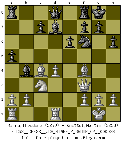 Last move : 1-0 2025 January 14 0:40:16 [Event "FICGS__CHESS__WCH_STAGE_2_GROUP_02__000028"] [Site "FICGS"] [Date "2024.11.25"] [Round "1"] [White "Mirra,Theodore"] [Black "Knittel,Martin"] [Result "1-0"] [WhiteElo "2279"] [BlackElo "2238"] 1.d4 Nf6 2.c4 e6 3.Nf3 d5 4.Nc3 dxc4 5.e4 Bb4 6.Bxc4 Nxe4 7.O-O Nf6 8.Qa4+ Nc6 9.Ne5 a5 10.Nxc6 bxc6 11.Qxc6+ Bd7 12.Qf3 O-O 13.Rd1 h6 14.Bf4 1-0 This chess game has been lost on time (started : 2024.11.25 0:52:58) Follow this game move after move (download)Chess is imagination. (David Bronstein) Am wohlsten fühle ich mich, wenn ich sehe, wie sich mein Gegner im Todeskampf windet. (Robert James Fischer) Los problemas de Ajedrez exigen del compositor las mismas virtudes que caracterizan todo el arte de valor: originalidad, invención, concisión, armonía, complejidad e insinceridad explendida. (Vladimir Nabokov) Aidez vos pièces, elles vous aideront. (Paul Morphy) There are two kinds of tragedy in this world, one is not getting what you want and the other is getting. (Lord of war)