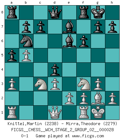 Last move : 0-1 2025 January 14 0:40:16 [Event "FICGS__CHESS__WCH_STAGE_2_GROUP_02__000028"] [Site "FICGS"] [Date "2024.11.25"] [Round "2"] [White "Knittel,Martin"] [Black "Mirra,Theodore"] [Result "0-1"] [WhiteElo "2238"] [BlackElo "2279"] 1.c4 e5 2.g3 Nf6 3.Bg2 d5 4.cxd5 Nxd5 5.Nc3 Nb6 6.Nf3 Nc6 7.O-O Be7 8.a3 O-O 9.b4 Be6 10.d3 a5 11.b5 Nd4 12.Be3 f6 13.Bxd4 exd4 0-1 This chess game has been lost on time (started : 2024.11.25 0:52:58) Follow this game move after move (download)Everything is in a state of flux, and this includes the world of Chess. (Mikhail Botvinnik) Die jungen Leute sollen verstehen, dass sie noch etwas von mir lernen können und müssen. (Viktor Kortschnoi) El jugador de combinación piensa hacia adelante; comienza de la posición dada y trabaja las movidas contundentes en su mente. (Emanuel Lasker) Tout change constamment, y compris dans le monde des Echecs. (Botvinnik) The quality of decision is like the well-timed swoop of a falcon which enables it to strike and destroy its victim. (Sun Tzu)