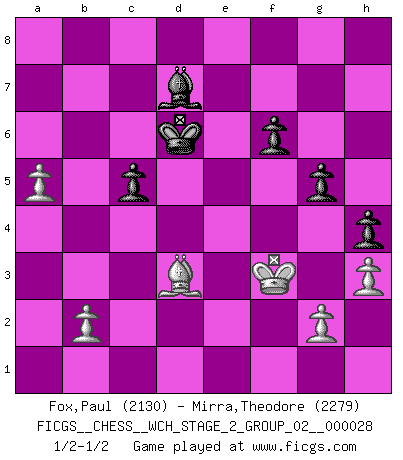 Last move : 1/2-1/2 2025 March 4 16:53:16 [Event "FICGS__CHESS__WCH_STAGE_2_GROUP_02__000028"] [Site "FICGS"] [Date "2024.11.25"] [Round "1"] [White "Fox,Paul"] [Black "Mirra,Theodore"] [Result "1/2-1/2"] [WhiteElo "2130"] [BlackElo "2279"] 1.e4 e5 2.Nf3 Nc6 3.Bb5 Nf6 4.O-O Nxe4 5.Re1 Nd6 6.Nxe5 Be7 7.Bf1 Nxe5 8.Rxe5 O-O 9.Nc3 Ne8 10.Nd5 Bd6 11.Re1 c6 12.Ne3 Be7 13.c4 Nc7 14.d4 d5 15.cxd5 Bb4 16.Bd2 Bxd2 17.Qxd2 Nxd5 18.Nxd5 Qxd5 19.Re5 Qd6 20.Bc4 Bd7 21.a3 Rae8 22.Qc3 g6 23.Rae1 Rxe5 24.dxe5 Qe7 25.Rd1 Bf5 26.Rd6 Re8 27.f4 Rd8 28.Qd4 Rxd6 29.exd6 Qe1+ 30.Bf1 Bd7 31.Qxa7 Qd2 32.Qxb7 Qd4+ 33.Kh1 Qxf4 34.Qa8+ Kg7 35.Qa6 Qd4 36.Qe2 c5 37.h3 Qxd6 38.Kg1 Qd4+ 39.Qf2 Qxf2+ 40.Kxf2 Kf6 41.Bc4 Ke7 42.Bb3 g5 43.Ke3 h5 44.a4 h4 45.a5 Bb5 46.Bc2 Kd6 47.Bf5 f6 48.Bd3 Bd7 49.Kf3 1/2-1/2 Follow this game move after move (download)The tactician knows what to do when there is something to do; whereas the strategian knows what to do when there is nothing to do. (Gerald Abrahams) Wenn Du einsam bist, wenn Du Dich in der Welt wie ein Fremder fühlst, spiele Schach. Das wird Deinen Geist erheben und Dein Ratgeber im Kampf sein. (Aristoteles) Siempre es mucho mejor sacrificar las piezas de tu oponente. (Savielly Tartakover) On peut tirer plus d'utilité d'une partie perdue que de 100 parties gagnées. (Capablanca) Humor is by far the most significant activity of the human brain. (Edward De Bono)