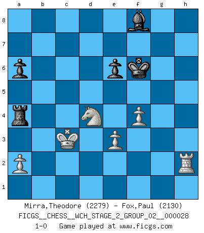 Last move : 1-0 2025 March 16 0:9:3 [Event "FICGS__CHESS__WCH_STAGE_2_GROUP_02__000028"] [Site "FICGS"] [Date "2024.11.25"] [Round "2"] [White "Mirra,Theodore"] [Black "Fox,Paul"] [Result "1-0"] [WhiteElo "2279"] [BlackElo "2130"] 1.Nf3 d5 2.d4 Nf6 3.c4 e6 4.g3 dxc4 5.Bg2 Nbd7 6.O-O Be7 7.Qc2 Rb8 8.Ne5 Nxe5 9.dxe5 Nd5 10.Qxc4 O-O 11.Qg4 f5 12.exf6 Bxf6 13.h4 b6 14.Nd2 c5 15.Ne4 Be5 16.Ng5 Nf6 17.Qc4 Qe7 18.Nf3 Bc7 19.Bg5 h6 20.Bxf6 Qxf6 21.b3 Bb7 22.Rad1 Bd5 23.Qc2 Qf5 24.Qxf5 Rxf5 25.Nd2 Rf7 26.Nb1 Rd8 27.Nc3 Bxg2 28.Rxd8+ Bxd8 29.Kxg2 Rc7 30.Rc1 a6 31.Ne4 Be7 32.h5 b5 33.e3 c4 34.bxc4 bxc4 35.f4 Kf7 36.Kf3 g6 37.hxg6+ Kxg6 38.g4 h5 39.gxh5+ Kxh5 40.Nd2 c3 41.Nb3 Ba3 42.Rc2 Kg6 43.Ke4 Kf6 44.Nd4 Rc4 45.Rh2 Ra4 46.Kd3 Bf8 47.Kxc3 1-0 This chess game has been lost on time (started : 2024.11.25 0:52:58) Follow this game move after move (download)Not only will I predict his triumph over Botvinnik, but I'll go further and say that he'll probably be the greatest Chess player that ever lived. (John Collins) Jeder leidlich begabte Spieler, er braucht keineswegs hervorragend veranlagt zu sein, kann es zum Meister bringen. Aber das ist ja auch gar nicht nötig! Der richtige Standpunkt ist es, zu seinem Vergnügen zu spielen, und man glaube ja nicht, dass der Genuss proportional dem Können sei. (Siegbert Tarrasch) Los Peones son nacidos libres, y aún así, se encuentran encadenados por todos lados. (Rick Kennedy) Il s'avisa de me proposer d'apprendre les échecs qu'il jouait un peu... me voilà forcené des échecs. J'achète un échiquier, je m'enferme dans ma chambre, j'y passe des jours et des nuits à vouloir apprendre par cur toutes les parties. (Jean-Jacques Rousseau, Confessions) Just because you do not take an interest in politics doesn't mean politics won't take an interest in you. (Pericles 430 B.C.)