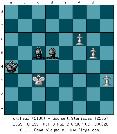 Last move : 0-1 2025 February 15 3:15:49 [Event "FICGS__CHESS__WCH_STAGE_2_GROUP_02__000028"] [Site "FICGS"] [Date "2024.11.25"] [Round "2"] [White "Fox,Paul"] [Black "Gounant,Stanislas"] [Result "0-1"] [WhiteElo "2130"] [BlackElo "2275"] 1.e4 e6 2.d4 d5 3.Nc3 dxe4 4.Nxe4 Nd7 5.Nf3 Ngf6 6.Nxf6+ Nxf6 7.Bd3 c5 8.dxc5 Bxc5 9.Bf4 O-O 10.Qe2 Qa5+ 11.c3 Nd5 12.Be5 f6 13.Bg3 Nxc3 14.Qd2 Bb4 15.O-O Nd5 16.Qc2 f5 17.Bc4 Bd7 18.a3 Be7 19.Rfe1 Rac8 20.Qd3 Rxc4 21.Qxc4 f4 22.Bh4 g5 23.b4 Qd8 24.Rad1 gxh4 25.Rxd5 exd5 26.Qxd5+ Rf7 27.Ne5 Be8 28.Qc4 Qd2 29.Nf3 Qd7 30.Ne5 Qb5 31.Qe6 Qb6 32.Qc4 Bg5 33.Nxf7 Bxf7 34.Qc8+ Kg7 35.h3 Qc6 36.Qxc6 bxc6 37.Rc1 Be8 38.Re1 Kf7 39.Re5 Bd8 40.Rf5+ Ke6 41.Rf8 Kd7 42.Rxf4 Bg6 43.Kf1 Be7 44.g3 Ke6 45.Ke2 Kd5 46.g4 c5 47.bxc5 Bxc5 48.Ra4 Be8 49.Ra5 Kd4 50.Ke1 Kc4 51.Ke2 Bb5 52.a4 Be8 53.Ra6 Kb3 54.Rh6 Bxa4 55.Rxh7 a5 56.Rxh4 Bb5+ 57.Kd1 Bd3 58.Kd2 Bc2 59.Rh6 Kb2 60.Ra6 a4 61.f4 a3 62.f5 Be4 63.f6 Bb7 64.Rxa3 Kxa3 65.Kc3 Bd5 66.g5 Ka4 0-1 Follow this game move after move (download)The winner of the game is the player who makes the next-to-last mistake. (Savielly Tartakover) Ich las kürzlich ein Buch von Nietzsche. Er sagte Religion verdumme nur die Menschen. Ich stimme zu. (Robert James Fischer) El Ajedrez es la vida. (Bobby Fischer) Même un GMI sait rarement calculer sur plus de cinq coups une attaque à sacrifices. (Rudolf Spielmann) Patience, use the Force, think ! (Obi-Wan Kenobi in Star Wars ep.2)