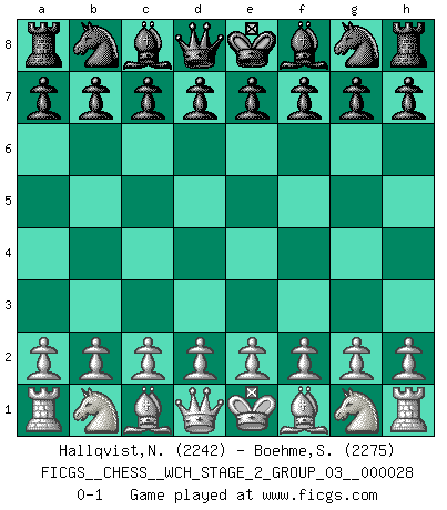 Last move : 0-1 2024 December 25 12:20:13 [Event "FICGS__CHESS__WCH_STAGE_2_GROUP_03__000028"] [Site "FICGS"] [Date "2024.11.25"] [Round "2"] [White "Hallqvist,Niklas"] [Black "Boehme,Sebastian"] [Result "0-1"] [WhiteElo "2242"] [BlackElo "2275"] 0-1 This chess game has been lost on time (started : 2024.11.25 0:53:0) Follow this game move after move (download)Via the squares on the chessboard, the Indians explain the movement of time and the age, the higher influences which control the world and the ties which link Chess with the human soul. (Al-Masudi) Kombinieren und Schwarzhandel gehören verboten. (Savielly Grigorievitsch Tartakower) Una victoria por una combinación errónea, aunque sea espectacular, me llena de horror artístico. (Wilhelm Steinitz) La tactique est l'élément le plus important du milieu de jeu. (Siegbert Tarrasch) I can't decide which is riskier; taking crazy risks, or taking advice on crazy risks from a crazy risk taker. (Gregory House in House M.D.)
