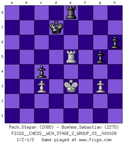 Last move : 1/2-1/2 2025 April 13 3:7:26 [Event "FICGS__CHESS__WCH_STAGE_2_GROUP_03__000028"] [Site "FICGS"] [Date "2024.11.25"] [Round "1"] [White "Pech,Stepan"] [Black "Boehme,Sebastian"] [Result "1/2-1/2"] [WhiteElo "2085"] [BlackElo "2275"] 1.d4 Nf6 2.c4 e6 3.Nc3 d5 4.Nf3 c6 5.e3 Nbd7 6.Bd3 dxc4 7.Bxc4 b5 8.Bd3 Bb7 9.O-O a6 10.e4 c5 11.d5 Qc7 12.dxe6 fxe6 13.Bc2 Bd6 14.Ng5 Nf8 15.f4 O-O-O 16.Qe2 h6 17.Nf3 Bxf4 18.Bxf4 Qxf4 19.g3 Qc7 20.e5 Nd5 21.a4 c4 22.axb5 axb5 23.Nd4 Qc5 24.Rad1 Nxc3 25.bxc3 Qd5 26.Rb1 Qh1+ 27.Kf2 Qxh2+ 28.Ke1 Qxe2+ 29.Kxe2 Rd5 30.Rxb5 Nd7 31.Ba4 Rxe5+ 32.Rxe5 Nxe5 33.Nxe6 g5 34.Rf5 Bc6 35.Rxe5 Bxa4 36.Ke3 Bd7 37.Nc5 Re8 38.Nxd7 Kxd7 1/2-1/2 Follow this game move after move (download)One doesn't have to play well, it's enough to play better than your opponent. (Siegbert Tarrasch) Mein erstes Ziel war nicht, die Partie zu gewinnen, sondern eine Figur zu opfern. -- der junge (Wilhelm Steinitz) Hasta este punto, las blancas han seguido un análisis bien conocido. Pero ahora el hace un error fatal: empieza a usar su propia cabeza. (Siegbert Tarrasch) La conception d'un plan est le processus par lequel un joueur exploite les avantages de sa position tout en s'efforçant d'en réduire au minimum les inconvénients. Afin de garantir le succès, un plan doit toujours se fonder sur un diagnostic objectif des particularités d'une position. La conception d'un plan est d'autant plus difficile que la position est équilibrée, et grandement facilitée lorsqu'il n'existe qu'un seul plan susceptible de répondre aux exigences de la position. (Harry Golombek) Mac users swear by their computers. PC users swear at their computers. (Author unknown)