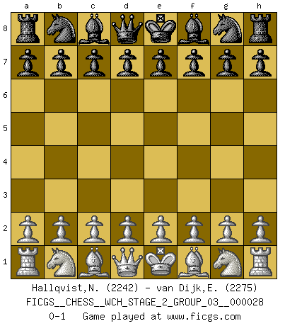 Last move : 0-1 2024 December 25 12:20:13 [Event "FICGS__CHESS__WCH_STAGE_2_GROUP_03__000028"] [Site "FICGS"] [Date "2024.11.25"] [Round "1"] [White "Hallqvist,Niklas"] [Black "van Dijk,Erik L."] [Result "0-1"] [WhiteElo "2242"] [BlackElo "2275"] 0-1 This chess game has been lost on time (started : 2024.11.25 0:53:0) Follow this game move after move (download)Place the contents of the Chess box in a hat, shake them up vigorously, pour them on the board from a height of two feet, and you get the style of Steinitz. (H. E. Bird) Ein Buch ist ein Spiegel; wenn ein Affe hineinsieht, so kann kein Apostel heraus gucken. (Georg Christoph Lichtenberg) Un Peón pasado aumenta su poder a medida de que el número de piezas en el tablero disminuye. (Capablanca) Les échecs, c'est la lutte contre l'erreur. (Johannes Zukertort) Shallow men believe in luck. Strong men belive in cause and effect. (Ralph Waldo Emerson)