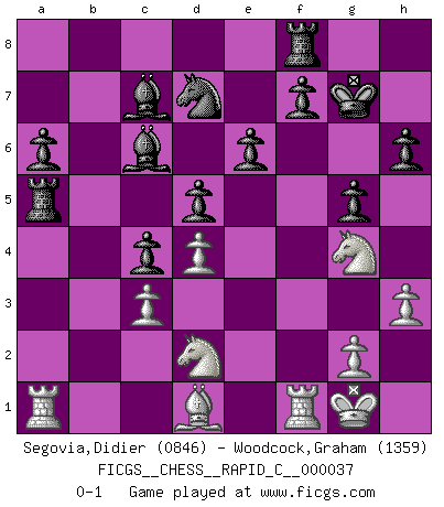 Last move : 0-1 2007 December 31 10:13:15 [Event "FICGS__CHESS__RAPID_C__000037"] [Site "FICGS"] [Date "2007.09.22"] [Round "1"] [White "Segovia,Didier"] [Black "Woodcock,Graham"] [Result "0-1"] [WhiteElo "0846"] [BlackElo "1359"] 1.e4 c5 2.c3 b6 3.d4 d5 4.e5 Nc6 5.Bb5 Bb7 6.Nf3 h6 7.O-O e6 8.Be3 a6 9.Be2 c4 10.Nbd2 Nge7 11.b3 b5 12.bxc4 bxc4 13.Qa4 Nf5 14.Bf4 Qd7 15.Rab1 Rb8 16.h3 g5 17.Bg3 Nxg3 18.fxg3 Nxe5 19.Qxd7+ Nxd7 20.a4 Bd6 21.a5 Bxg3 22.Nh2 O-O 23.Ng4 Kg7 24.Rf3 Bc7 25.Ra1 Bc6 26.Bd1 Rb5 27.Rf1 Rxa5 0-1 This chess game has been lost on time (started : 2007.09.22 17:20:34) Sicilian : Alapin's variation (2.c3) Kingside Castling by player White (move 7) Kingside Castling by player Black (move 22) Player Black won this chess game. Follow this game move after move (download)Chess is 99 percent tactics. (Teichmann) Es war undenkbar für die Behörden, dass ein sowjetischer Großmeister auf diese Art und Weise [Fischer-Taimanov 6:0] verliert, ohne dass es eine politischer Erklärung dafür gäbe. (Mark Taimanov) Yo considero que Fischer es uno de los expertos mas grandes de aperturas de siempre. (Keith Hayward) Le jeu d'échecs fait naître et fortifie en nous plusieurs qualités précieuses dans le cours de l'existence, telles que la prévoyance, la circonspection, la prudence, et la persévérance. (Benjamin Franklin - 1783, la morale des échecs) The best weapon against an enemy is another enemy. (Friedrich Nietzsche)