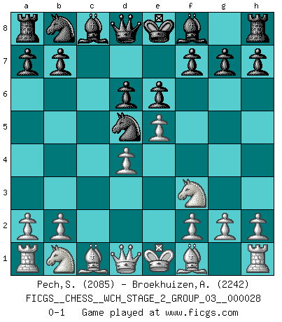 Last move : 0-1 2025 February 2 0:59:45 [Event "FICGS__CHESS__WCH_STAGE_2_GROUP_03__000028"] [Site "FICGS"] [Date "2024.11.25"] [Round "1"] [White "Pech,Stepan"] [Black "Broekhuizen,A. T. S."] [Result "0-1"] [WhiteElo "2085"] [BlackElo "2242"] 1.e4 c5 2.c3 Nf6 3.e5 Nd5 4.d4 cxd4 5.Nf3 d6 6.cxd4 e6 0-1 Follow this game move after move (download)If you aren't afraid of Spassky, then I have removed the element of money. (Jim Slater) Im Schach nämlich geht es darum, daß Ich des Gegners klein zu kriegen, sein Ego zu zerbrechen und zu zermahlen, seine Selbstachtung zu zertreten und zu verscharren und seine ganze mißachtenswerte sogenannte Persönlichkeit ein für alle Mal tot zu hacken und zu zerstampfen und dadurch die menschliche Gesellschaft von einer stinkenden Pestbeule zu befreien. Es ist ein königliches Spiel. (Robert James Fischer) Por tratar de evitar la pérdida de una pieza, muchas personas han perdido una partida de Ajedrez. (Savielly Tartakover) On croit qu'il y a plus de mauvais joueurs que de bons joueurs, c'est faux : Il y a autant de joueurs qui gagnent que de joueurs qui perdent. (Philippe Geluck) O divine art of subtlety and secrecy! Through you we learn to be invisible, through you inaudible and hence we can hold the enemy's fate in our hands. (Sun Tzu)