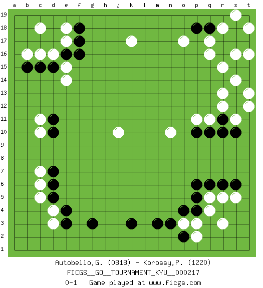 Last move : 0-1 2025 March 7 19:40:0 [Event "FICGS__GO__TOURNAMENT_KYU__000217"] [Site "FICGS"] [Date "2024.11.25"] [Round "1"] [Black "Autobello,Giovanni"] [White "Korossy,Peter"] [Result "0-1"] [Rating 1 "0818"] [Rating 2 "1220"] 1.k3 d4 2.g3 q4 3.m3 o3 4.o4 p3 5.p4 q5 6.p5 q16 7.p6 d16 8.d15 c16 9.c15 c11 10.n3 q11 11.q10 p11 12.p10 o17 13.e4 d3 14.e3 c6 15.q6 r5 16.r6 s5 17.s6 r3 18.e16 b16 19.b15 e17 20.f17 e18 21.f18 c18 22.r11 r12 23.s12 r13 24.s13 s11 25.r10 s14 26.t14 t12 27.s10 t13 28.t15 k17 29.d5 c5 30.d6 c7 31.d7 j10 32.d10 c10 33.d11 n10 34.o2 p2 35.s15 r15 36.r16 s16 37.r17 q17 38.s17 t16 39.t17 r18 40.s18 s19 41.q18 t18 42.p18 e15 43.f16 e14 0-1 Follow this game move after move (download)Extend one hand from the cutting points. (Anonymous) The age of a woman doesn't mean a thing. The best tunes are played on the oldest fiddles. (Ralph Waldo Emerson)
