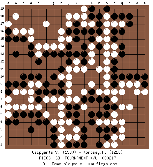 Last move : 1-0 2025 February 23 5:22:44 [Event "FICGS__GO__TOURNAMENT_KYU__000217"] [Site "FICGS"] [Date "2024.11.25"] [Round "1"] [Black "Osipyants,Vladimir"] [White "Korossy,Peter"] [Result "1-0"] [Rating 1 "1300"] [Rating 2 "1220"] 1.q16 q4 2.d3 d16 3.c5 o17 4.m16 o15 5.q14 l15 6.m15 m14 7.n14 n15 8.l14 m13 9.k15 o13 10.l13 m12 11.d10 j17 12.k16 f17 13.d13 h4 14.m4 k3 15.o3 q3 16.o5 r6 17.q10 q8 18.p12 l17 19.l16 m17 20.k17 k18 21.n17 l18 22.n16 o16 23.n18 m9 24.m7 n8 25.n7 o8 26.o7 p7 27.c15 c16 28.g3 g4 29.f4 f5 30.e4 j8 31.k6 h6 32.l3 k2 33.l2 d8 34.c9 c8 35.g8 h7 36.f8 e9 37.g10 j10 38.h11 e6 39.e10 d9 40.c10 g14 41.f13 c6 42.d5 d6 43.p18 e14 44.d14 e13 45.e12 f14 46.g13 h15 47.j14 h14 48.h13 b16 49.b15 d15 50.b13 h3 51.g2 p2 52.o2 r9 53.r10 p17 54.q18 q17 55.r17 o18 56.r18 b6 57.b5 a5 58.a4 a6 59.b4 k12 60.l12 l11 61.j13 j11 62.j12 n11 63.s10 s9 64.t9 t8 65.t10 s8 66.p10 o10 67.p9 p8 68.f9 l8 69.l7 k7 70.j6 j7 71.k4 p13 72.q13 o12 73.p11 p5 74.p3 q2 75.k1 j2 76.j1 h1 77.l1 h2 78.g1 j4 79.j5 h5 80.a16 a17 81.a15 b18 82.j16 h16 83.m18 j18 84.o19 b8 85.b9 g7 86.e7 f7 87.e8 p14 88.p15 l6 89.k5 o4 90.n5 p4 91.n3 o9 92.k13 k11 93.h9 j9 94.a8 a7 95.a9 d7 96.p6 q6 97.o6 h10 98.h8 l19 99.m19 o1 100.n1 p1 101.p16 o14 102.e5 n4 103.m5 o11 104.m8 j15 105.pass q9 106.pass pass 107.pass 1-0 Follow this game move after move (download)Take the cutting stone on the second line. (Anonymous) Happy endings are just stories that haven't finished yet. (Jane Smith in Mr & Mrs Smith)