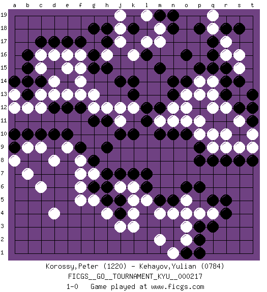 Last move : 1-0 2025 June 2 20:43:20 [Event "FICGS__GO__TOURNAMENT_KYU__000217"] [Site "FICGS"] [Date "2024.11.25"] [Round "1"] [Black "Korossy,Peter"] [White "Kehayov,Yulian"] [Result "1-0"] [Rating 1 "1220"] [Rating 2 "0784"] 1.q16 d4 2.q3 c16 3.e17 q10 4.r5 c6 5.c14 q4 6.r4 p4 7.p3 o4 8.r8 r10 9.r13 q13 10.r14 q14 11.r15 r12 12.o16 r17 13.q17 q18 14.p18 q19 15.s18 r16 16.q15 s16 17.r18 s15 18.s14 e16 19.d17 d16 20.c17 c13 21.b14 d14 22.b16 c15 23.b15 c12 24.k10 k4 25.k7 g7 26.h9 k12 27.p12 q12 28.p8 p11 29.n10 o12 30.h6 g5 31.h5 h4 32.g6 f5 33.k14 k16 34.m15 p13 35.h15 h16 36.g15 f16 37.g16 g17 38.f17 f15 39.h17 f14 40.l12 j12 41.l11 r9 42.s8 s9 43.f9 d8 44.g11 g12 45.h11 h12 46.n5 n4 47.m5 m4 48.p6 o3 49.d10 c9 50.c10 b9 51.b10 f6 52.g8 f7 53.h7 l5 54.l6 k6 55.l7 j6 56.j5 k5 57.j4 j3 58.j7 k3 59.o10 o13 60.t11 t12 61.s12 s11 62.t13 t10 63.t12 t9 64.t8 a13 65.e12 e13 66.d12 d13 67.f12 e15 68.n14 g13 69.a9 a8 70.a10 b7 71.b13 b12 72.a14 a12 73.n13 n12 74.m12 o11 75.p9 p10 76.p2 o2 77.o1 n1 78.p1 m2 79.j14 f13 80.p15 p14 81.o14 n11 82.q5 o5 83.o6 q9 84.q8 m11 85.m10 j11 86.j10 e9 87.e10 f8 88.k13 j17 89.h18 j18 90.g18 m17 91.n18 m18 92.l16 l17 93.k18 j19 94.m19 l19 95.n19 1-0 Follow this game move after move (download)A meijin needs no joseki. (Anonymous) Every now and then a man's mind is stretched by a new idea and never shrinks back to its former dimensions. (Oliver Wendell Holmes, Sr.)