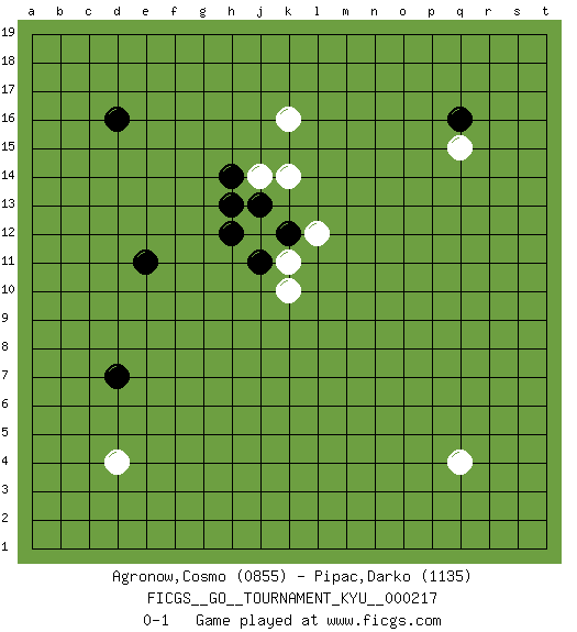 Last move : 0-1 2025 January 26 3:31:58 [Event "FICGS__GO__TOURNAMENT_KYU__000217"] [Site "FICGS"] [Date "2024.11.25"] [Round "1"] [Black "Agronow,Cosmo"] [White "Pipac,Darko"] [Result "0-1"] [Rating 1 "0855"] [Rating 2 "1135"] 1.q16 q4 2.d16 d4 3.d7 k10 4.e11 k16 5.k12 j12 6.h14 j14 7.j13 k14 8.h13 k11 9.j11 q15 10.h12 l12 0-1 This go game has been lost on time (started : 2024.11.25 20:21:14) Follow this game move after move (download)White is always trying to kill a bigger group than black is trying to save. (Anonymous) There will be no order, only chaos. (Sol Robeson in Pi by Darren Aronofsky)