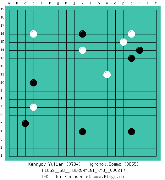 Last move : 1-0 2025 January 9 14:7:15 [Event "FICGS__GO__TOURNAMENT_KYU__000217"] [Site "FICGS"] [Date "2024.11.25"] [Round "1"] [Black "Kehayov,Yulian"] [White "Agronow,Cosmo"] [Result "1-0"] [Rating 1 "0784"] [Rating 2 "0855"] 1.c5 q16 2.q4 d16 3.r14 d7 4.k4 p15 5.q13 n11 6.k16 k14 7.d10 1-0 This go game has been lost on time (started : 2024.11.25 20:21:14) Follow this game move after move (download)A knight's move near the edge of the board cannot be cut. (Bill Taylor) Men never do evil so completely and cheerfully as when they do it from religious conviction. (Blaise Pascal)