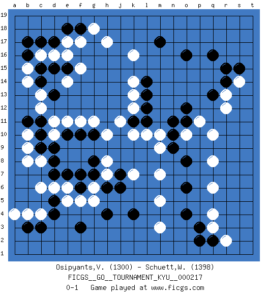 Last move : 0-1 2025 February 8 5:4:10 [Event "FICGS__GO__TOURNAMENT_KYU__000217"] [Site "FICGS"] [Date "2024.11.25"] [Round "1"] [Black "Osipyants,Vladimir"] [White "Schuett,Wilhelm"] [Result "0-1"] [Rating 1 "1300"] [Rating 2 "1398"] 1.q16 q4 2.d4 d16 3.f3 d10 4.o16 q10 5.k4 k16 6.m17 r13 7.r14 s14 8.r15 c6 9.d8 c8 10.c9 b8 11.d9 e6 12.e10 d11 13.d7 d6 14.e7 g6 15.h4 h17 16.c17 c16 17.d17 e17 18.e18 f17 19.f18 g18 20.b16 b15 21.b17 m3 22.o4 m5 23.o6 q6 24.j6 m7 25.o8 q8 26.p3 q3 27.q2 r2 28.p2 k7 29.j7 o10 30.n9 m10 31.n10 m9 32.n11 e11 33.f10 f11 34.g10 g11 35.c15 b14 36.d15 e16 37.c14 c13 38.e15 f15 39.d13 e14 40.q13 r12 41.o11 p11 42.o12 b9 43.c10 b10 44.c11 c12 45.b11 c4 46.c3 b4 47.b3 k10 48.l14 k14 49.l13 k13 50.l12 k12 51.l11 h10 52.g8 l10 53.k11 j11 54.s15 h8 55.g7 h7 56.f6 f5 57.f7 g5 58.h6 a4 59.d5 e5 0-1 Follow this game move after move (download)In the sound of the stone you can hear its purpose. (Pierre Audouard) Beta. Software undergoes beta testing shortly before it's released. Beta is latin for still doesn't work. (Anonymous)