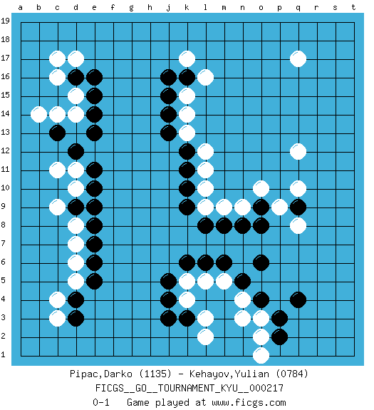Last move : 0-1 2025 April 17 17:7:50 [Event "FICGS__GO__TOURNAMENT_KYU__000217"] [Site "FICGS"] [Date "2024.11.25"] [Round "1"] [Black "Pipac,Darko"] [White "Kehayov,Yulian"] [Result "0-1"] [Rating 1 "1135"] [Rating 2 "0784"] 1.d3 c16 2.q4 q17 3.k10 k4 4.k3 d10 5.d9 d8 6.e9 c9 7.e8 d7 8.e7 d6 9.e6 l3 10.j3 n4 11.j4 k5 12.j5 q10 13.k16 k15 14.j15 k14 15.j14 k13 16.j13 l16 17.k6 l5 18.l6 m5 19.o6 q12 20.q9 l12 21.d16 c17 22.c13 c11 23.d12 c4 24.d4 d5 25.e5 k17 26.j16 d15 27.e16 d17 28.e15 d14 29.e13 c14 30.e14 b14 31.k12 l11 32.k11 l10 33.k9 l9 34.l8 n9 35.o9 o10 36.n8 m9 37.m8 p9 38.o8 q8 39.e10 d11 40.e11 c3 41.o4 n3 42.n5 o3 43.p3 o2 44.m6 l2 45.p2 o1 0-1 This go game has been lost on time (started : 2024.11.25 20:21:14) Follow this game move after move (download)Each step in a ladder is worth 7 points. (Anonymous) Animated gif is worth one mega-word. (Unknown)
