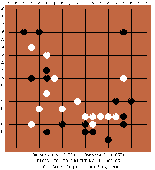 Last move : 1-0 2025 January 15 16:17:43 [Event "FICGS__GO__TOURNAMENT_KYU_I__000105"] [Site "FICGS"] [Date "2024.11.28"] [Round "1"] [Black "Osipyants,Vladimir"] [White "Agronow,Cosmo"] [Result "1-0"] [Rating 1 "1300"] [Rating 2 "0855"] 1.q16 d4 2.c16 p5 3.q4 n5 4.q5 o5 5.r7 d14 6.e16 f13 7.d10 f8 8.f10 g10 9.f11 k7 10.h4 e6 11.f3 h6 12.l4 m4 13.l3 l5 14.m3 m5 15.o2 q10 16.p7 1-0 This go game has been lost on time (started : 2024.11.28 16:16:53) Follow this game move after move (download)Do not make moves that strengthen your opponent ! (Anonymous) Logic : The art of thinking and reasoning in strict accordance with the limitations and incapacities of the human misunderstanding. (Ambrose Bierce)