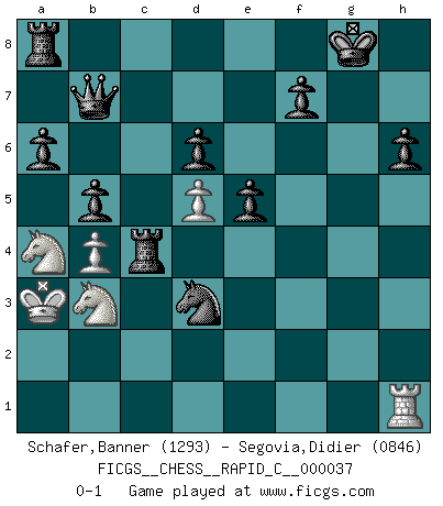 Last move : 0-1 2007 November 16 6:34:39 [Event "FICGS__CHESS__RAPID_C__000037"] [Site "FICGS"] [Date "2007.09.22"] [Round "1"] [White "Schafer,Banner"] [Black "Segovia,Didier"] [Result "0-1"] [WhiteElo "1293"] [BlackElo "0846"] 1.e4 e5 2.d4 d6 3.d5 Nf6 4.Bg5 Be7 5.Bxf6 Bxf6 6.Nf3 Bg4 7.c4 c6 8.Nc3 O-O 9.Be2 c5 10.a3 a6 11.b4 b6 12.O-O Nd7 13.h3 Bh5 14.Qa4 Qc8 15.g4 Bg6 16.h4 h6 17.Qc2 Bh7 18.g5 hxg5 19.hxg5 Be7 20.Kg2 Nb8 21.Rh1 Qg4+ 22.Kf1 Bxg5 23.Rg1 Qh3+ 24.Ke1 Bf4 25.Kd1 Nd7 26.Nd2 cxb4 27.axb4 Qh2 28.Rf1 Nf6 29.Kc1 Qg2 30.Kb2 Qh3 31.Rh1 Qd7 32.Rh4 Rfc8 33.Na4 Qb7 34.Nb3 Bxe4 35.Bd3 b5 36.Bxe4 Rxc4 37.Rah1 Bh6 38.Qd2 Nxe4 39.Qd3 Nxf2 40.Rxh6 Nxd3+ 41.Ka3 gxh6 0-1 King's pawn game Kingside Castling by player Black (move 8) Kingside Castling by player White (move 12) Player Black won this chess game. Follow this game move after move (download)All Chess players should have a hobby. (Savielly Tartakower) Schach ist Leben. (Robert James Fischer) Aquel que teme a un Peón de Reina aislado, debería de retirarse del Ajedrez. (Siegbert Tarrasch) Plusieurs personnes se sont demandées comment Tal faisait pour gagner... En fait, c'est très simple ! Il met ses pièces au centre de l'échiquier et les sacrifie quelque part ! (David Bronstein) Political correctness is subjecting us to gross incompetence. (Johann Piek)