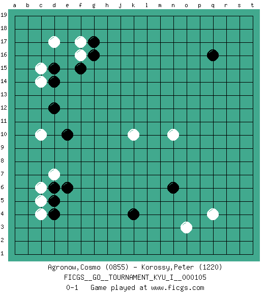 Last move : 0-1 2025 January 22 0:13:35 [Event "FICGS__GO__TOURNAMENT_KYU_I__000105"] [Site "FICGS"] [Date "2024.11.28"] [Round "1"] [Black "Agronow,Cosmo"] [White "Korossy,Peter"] [Result "0-1"] [Rating 1 "0855"] [Rating 2 "1220"] 1.q16 q4 2.d15 d17 3.f15 c15 4.d4 c6 5.d6 d7 6.e6 c5 7.d5 c4 8.e10 c10 9.d12 f17 10.g17 f16 11.g16 c14 12.d14 k10 13.n6 n10 14.k4 o3 0-1 This go game has been lost on time (started : 2024.11.28 16:16:53) Follow this game move after move (download)There are players who don't accept exchange: they play many moves that perpetuate a previous state of the game. (Pierre Audouard) The best weapon against an enemy is another enemy. (Friedrich Nietzsche)