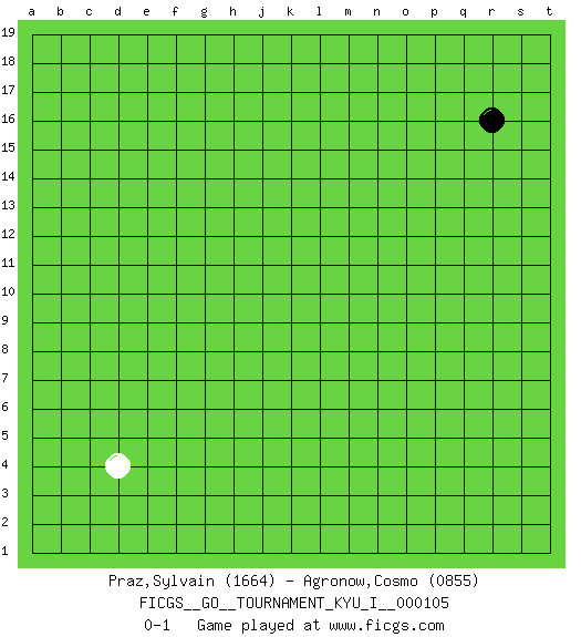 Last move : 0-1 2025 January 10 15:29:1 [Event "FICGS__GO__TOURNAMENT_KYU_I__000105"] [Site "FICGS"] [Date "2024.11.28"] [Round "1"] [Black "Praz,Sylvain"] [White "Agronow,Cosmo"] [Result "0-1"] [Rating 1 "1664"] [Rating 2 "0855"] 1.r16 d4 0-1 This go game has been lost on time (started : 2024.11.28 16:16:53) Follow this game move after move (download)Everything happens on a grid-engraved board with black and white pieces, but if that's all you see then you don't know Go. (Pierre Audouard) The beginning of wisdom is silence. The second step is listening. (Unknown)