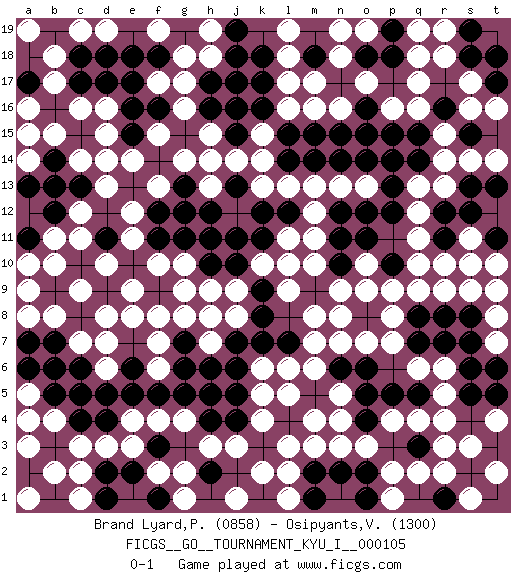 Last move : 0-1 2025 January 27 8:58:5 [Event "FICGS__GO__TOURNAMENT_KYU_I__000105"] [Site "FICGS"] [Date "2024.11.28"] [Round "1"] [Black "Brand Lyard,Paul"] [White "Osipyants,Vladimir"] [Result "0-1"] [Rating 1 "0858"] [Rating 2 "1300"] 1.c4 q4 2.d5 q16 3.d4 d16 4.e16 d15 5.c15 d14 6.c13 c14 7.b14 b15 8.e15 d13 9.e13 e14 10.f14 f13 11.g13 e12 12.b12 c12 13.b13 c11 14.c10 b11 15.f12 f15 16.f16 g14 17.d11 e11 18.e10 f10 19.f9 e9 20.c17 c16 21.r7 r14 22.c8 d10 23.q7 q10 24.r11 r10 25.j7 k10 26.h12 h14 27.h10 g9 28.g7 h9 29.e7 f8 30.h5 o3 31.o2 p2 32.f5 k4 33.m5 m3 34.b7 c9 35.b6 h3 36.g12 e3 37.f3 f2 38.h2 g2 39.c6 c2 40.h4 j3 41.k12 k14 42.k8 n13 43.g11 m10 44.l10 l9 45.m14 l13 46.l12 m12 47.d17 g16 48.o6 m7 49.k16 g17 50.h17 n16 51.e6 l6 52.o11 o9 53.m18 l17 54.p13 q11 55.b9 b10 56.h16 h15 57.n17 m17 58.m15 m16 59.o16 o17 60.r12 q12 61.j11 l11 62.j13 k13 63.r17 q17 64.o15 n18 65.o14 q13 66.q15 r15 67.o8 n8 68.o4 n3 69.b3 b2 70.q5 r4 71.k18 l18 72.q8 o7 73.f18 g18 74.s8 r9 75.m2 l2 76.s2 s3 77.j18 p7 78.n11 m11 79.p18 q18 80.j5 k5 81.s13 s9 82.s10 s11 83.g6 f4 84.s18 s16 85.l4 m4 86.o5 r5 87.s12 t10 88.b5 d8 89.h8 j9 90.t6 a9 91.r2 b8 92.k1 c3 93.j10 h13 94.l8 j8 95.p10 p9 96.e2 d3 97.s6 r6 98.a11 d7 99.s7 a3 100.n10 b4 101.d18 b17 102.k7 g8 103.q14 r13 104.j6 h7 105.p5 p4 106.p12 q9 107.d1 f7 108.s15 s14 109.j15 j14 110.l15 k15 111.g5 d6 112.e17 b18 113.k9 n9 114.p15 l16 115.m1 l3 116.j2 g4 117.o12 l5 118.a7 a5 119.e5 c7 120.h6 e4 121.j16 m8 122.n6 p8 123.p6 q6 124.a13 p16 125.n15 o13 126.h1 g1 127.j17 h18 128.b16 a15 129.l7 m6 130.p14 a14 131.q3 q2 132.n2 k2 133.s5 r3 134.c18 f17 135.n4 n7 136.c5 k6 137.r8 t8 138.o18 o19 139.s4 t4 140.d2 n5 141.q1 l1 142.o1 p1 143.a17 f19 144.n14 m13 145.t3 t2 146.e18 c19 147.t11 t9 148.m19 n19 149.t13 t14 150.f1 j1 151.k17 d19 152.r16 s17 153.j19 l19 154.b1 c1 155.l14 h19 156.t5 t7 157.k11 h8 158.j4 l10 159.r1 s1 160.n12 o10 161.f11 g10 162.a2 a8 163.p19 q19 164.t15 r18 165.s19 f6 166.t17 r19 167.a18 a16 168.a6 e8 169.t18 a19 170.h11 a10 171.h5 t16 172.g6 pass 173.t5 pass 174.b6 pass 175.k8 pass 176.c5 pass 177.e5 pass 178.g7 pass 179.j6 pass 180.f5 pass 181.r16 pass 182.a7 pass 183.s15 pass 184.s2 pass 185.k7 pass 186.d5 pass 187.r8 pass 188.pass pass 189.h4 pass 190.s7 pass 191.d4 pass 192.p5 pass 193.j5 pass 194.o5 pass 195.o6 pass 196.c6 pass 197.l7 pass 198.g5 pass 199.h2 pass 200.q7 pass 201.s6 pass 202.pass pass 203.a17 pass 204.m18 pass 205.r1 r2 206.o4 pass 207.b5 pass 208.q8 pass 209.pass pass 210.q5 pass 211.k9 pass 212.s5 pass 213.t6 pass 214.s8 pass 215.r7 pass 216.h6 pass 217.c4 a1 218.b7 pass 219.j7 pass 220.pass pass 221.j4 pass 222.pass pass 223.e6 pass 224.n6 n4 225.a6 a4 226.pass s10 0-1 Follow this game move after move (download)Knight's moves win running battles. (Anonymous) He who laughs last probably does not get the joke. (Unknown)