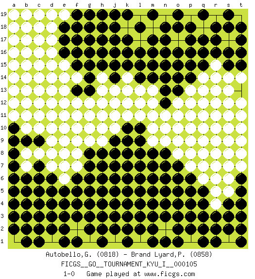 Last move : 1-0 2025 July 27 9:53:30 [Event "FICGS__GO__TOURNAMENT_KYU_I__000105"] [Site "FICGS"] [Date "2024.11.28"] [Round "1"] [Black "Autobello,Giovanni"] [White "Brand Lyard,Paul"] [Result "1-0"] [Rating 1 "0818"] [Rating 2 "0858"] 1.l4 k4 2.k16 j16 3.l5 l6 4.j15 j17 5.k17 k5 6.k6 m7 7.l7 j8 8.m6 n6 9.m5 s5 10.m8 m9 11.n7 p9 12.o6 n11 13.n5 o5 14.o4 q7 15.p5 h11 16.h16 m15 17.j5 n4 18.h17 r12 19.n3 o3 20.m4 k7 21.o2 f8 22.p3 l11 23.j4 g6 24.k3 g5 25.j18 q14 26.q4 d5 27.h4 h3 28.g3 q8 29.h2 k2 30.j3 h9 31.l2 p8 32.j2 l19 33.k1 h7 34.m1 q11 35.n1 f14 36.k8 l13 37.j7 j10 38.h6 f10 39.l9 n9 40.h5 f12 41.k10 m10 42.k9 k11 43.j9 p10 44.h8 o8 45.g7 d9 46.f6 j13 47.f5 d7 48.g4 f4 49.e4 e11 50.f3 q2 51.r3 p1 52.s2 d4 53.d3 o12 54.r1 e8 55.p2 r5 56.o1 q6 57.q1 e6 58.r2 h13 59.q3 c3 60.c2 b2 61.b1 g10 62.e5 r4 63.l10 j12 64.a2 b3 65.a3 b5 66.b4 f7 67.c4 c6 68.c5 g6 69.g5 b8 70.d6 c8 71.s4 s7 72.d5 p7 73.a5 r8 74.b6 g9 75.c7 b7 76.a7 s6 77.t5 s10 78.a8 m13 79.b9 c10 80.c9 b10 81.a9 b11 82.l18 m18 83.m17 g12 84.t6 t8 85.m19 d12 86.k19 c12 87.n18 b13 88.l15 h14 89.m14 o15 90.m16 t12 91.n15 f18 92.o14 a11 93.o16 o17 94.p15 q16 95.p17 r10 96.o18 d14 97.n17 q18 98.q17 s17 99.r16 g16 100.q15 e9 101.p16 r14 102.r18 d16 103.p18 t14 104.q19 t16 105.s15 h18 106.g18 d18 107.h19 s18 108.s19 k14 109.t18 r7 110.r17 e13 111.s16 c15 112.t17 p13 113.t15 s14 114.f19 d19 115.e18 d10 116.f17 c14 117.f16 e15 118.g15 b16 119.g17 d17 120.e17 b17 121.n13 s11 122.t4 t7 123.n12 m12 124.o13 n10 125.p14 q12 126.n8 o9 127.a10 e19 128.o7 o11 129.p6 a12 130.g8 t3 131.s3 f2 132.e2 a15 133.g2 d1 134.f1 j1 135.h1 n19 136.t2 b18 137.o19 a14 138.e1 r15 139.c1 s13 140.d2 c19 141.a6 c17 142.q5 m3 143.l3 f11 144.m2 p12 145.e16 s9 146.g14 t10 147.g13 c16 148.f13 c13 149.f15 a17 150.h15 r9 151.j14 a16 152.l14 c18 153.k15 b19 154.f18 s1 155.t1 b14 156.c6 s17 157.t16 r13 158.s18 a19 159.t3 q9 160.p4 o10 161.j8 c11 162.g6 a13 163.l8 q10 164.h7 p11 165.b5 d11 166.n14 b15 167.k7 s8 168.j6 a18 169.q16 l17 170.m7 k12 171.l16 b3 172.c3 e14 173.b2 q13 174.l6 d15 175.g19 r11 176.o5 s12 177.o3 e10 178.f4 j11 179.o15 h10 180.d4 r6 181.n6 e7 182.g16 b12 183.b3 d13 184.k5 g11 185.a4 j16 186.j17 t11 187.k4 l12 188.n4 t9 189.m3 k13 190.m15 e12 191.h18 m11 192.h3 d8 193.j16 h12 194.q2 f9 195.n16 pass 196.e3 pass 197.pass pass 198.k2 pass 199.pass pass 200.j19 1-0 Follow this game move after move (download)Five groups might live but the six will die. (Anonymous) Lamb in skin of tiger, still fears the wolf. (Chinese proverb)