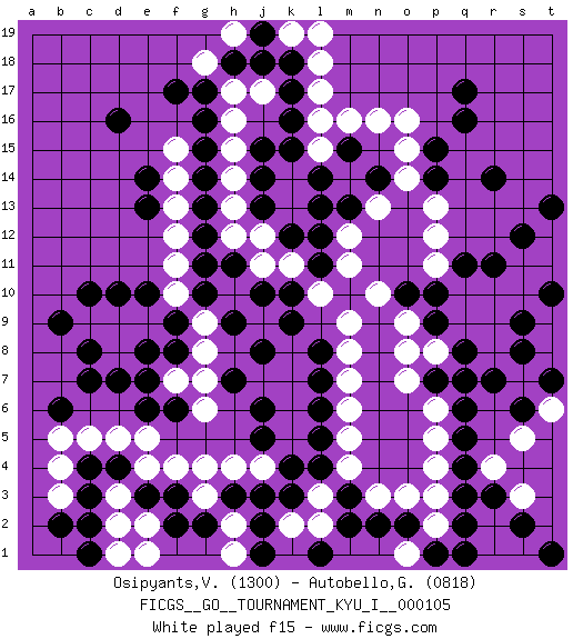 Last move : 1-0 2025 May 16 19:13:49 [Event "FICGS__GO__TOURNAMENT_KYU_I__000105"] [Site "FICGS"] [Date "2024.11.28"] [Round "1"] [Black "Osipyants,Vladimir"] [White "Autobello,Giovanni"] [Result "1-0"] [Rating 1 "1300"] [Rating 2 "0818"] 1.q16 n16 2.d4 d5 3.q4 p5 4.q5 t6 5.d16 p4 6.q3 p3 7.q6 p6 8.q8 p8 9.p7 o7 10.q7 e4 11.c4 c5 12.e3 f4 13.f3 g3 14.g2 h2 15.f2 q9 16.h3 g4 17.j2 h1 18.k3 h4 19.j3 j4 20.k4 k5 21.d10 r8 22.r7 s7 23.s8 r9 24.s9 s10 25.s6 s5 26.t7 r4 27.r3 s3 28.s2 r2 29.q2 r1 30.q1 s1 31.t1 t11 32.r14 p2 33.p1 o1 34.o2 o3 35.n2 n3 36.m2 l3 37.m3 m4 38.l4 l2 39.l1 k2 40.l5 m5 41.l6 m6 42.l7 m7 43.l8 m8 44.j5 k6 45.j6 k7 46.j8 k8 47.k9 j7 48.h7 d3 49.c3 d2 50.c2 d1 51.c1 e1 52.j1 m9 53.p9 o8 54.p10 q10 55.q11 r10 56.r11 s11 57.s12 t12 58.t13 p11 59.t10 p12 60.p14 p13 61.k16 o14 62.p15 o15 63.f17 o9 64.o10 n10 65.k12 o16 66.q17 l10 67.k10 k11 68.l11 j11 69.l13 m11 70.l12 m12 71.m13 m14 72.l14 l15 73.k15 l16 74.k17 l17 75.n14 n13 76.m15 m16 77.k18 l18 78.e7 e2 79.c7 j12 80.j13 h13 81.j14 k19 82.j19 l19 83.h18 b4 84.b6 b5 85.e6 b3 86.b2 h14 87.g11 h10 88.g10 g9 89.h9 f10 90.f9 g8 91.f8 g7 92.h11 h12 93.e13 e9 94.e10 f11 95.g12 f12 96.g13 f13 97.g14 h15 98.e14 f14 99.g15 h16 100.g16 h17 101.g17 j17 102.j18 g18 103.j10 f7 104.e8 d9 105.c10 d8 106.d7 e5 107.f6 g6 108.c8 c9 109.b9 h19 110.j15 f15 111.e17 e16 112.e15 e12 113.f16 d12 114.pass c6 115.b7 a6 116.p18 o18 117.o11 p17 118.p16 o17 119.q18 o19 120.p19 c11 121.b11 b12 122.d11 1-0 Follow this game move after move (download)When your opponent has two weak groups, attack them both at once. (Anonymous) I can't decide which is riskier; taking crazy risks, or taking advice on crazy risks from a crazy risk taker. (Gregory House in House M.D.)