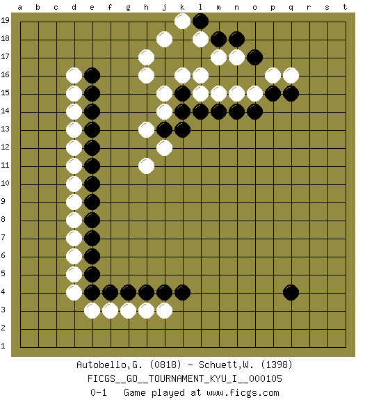 Last move : 0-1 2025 April 17 17:7:50 [Event "FICGS__GO__TOURNAMENT_KYU_I__000105"] [Site "FICGS"] [Date "2024.11.28"] [Round "1"] [Black "Autobello,Giovanni"] [White "Schuett,Wilhelm"] [Result "0-1"] [Rating 1 "0818"] [Rating 2 "1398"] 1.q4 d4 2.e4 d16 3.e16 q16 4.q15 p16 5.p15 d15 6.e15 d5 7.e5 d7 8.e7 d13 9.e13 d10 10.e10 d9 11.e9 g3 12.g4 j3 13.j4 e3 14.e6 d6 15.f4 f3 16.h4 h3 17.e8 d8 18.e11 d11 19.e12 d12 20.e14 d14 21.k4 k16 22.k15 l15 23.l14 m15 24.m14 n15 25.n14 o15 26.o14 j15 27.k14 j14 28.j16 h16 29.j17 h17 30.k17 l16 31.l17 m17 32.m18 n17 33.n18 j18 34.k18 k19 35.l19 l18 36.o17 j12 37.j13 h13 38.k13 h11 0-1 This go game has been lost on time (started : 2024.11.28 16:16:53) Follow this game move after move (download)Add one stone, then sacrifice both. (Anonymous) Gambling is the son of avarice and the father of despair. (French proverb)