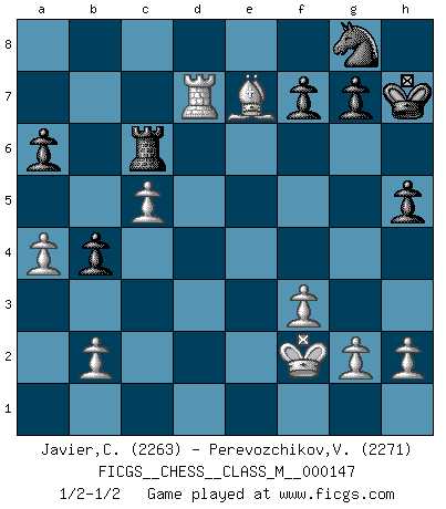 Last move : 1/2-1/2 2025 February 12 22:23:40 [Event "FICGS__CHESS__CLASS_M__000147"] [Site "FICGS"] [Date "2024.11.29"] [Round "1"] [White "Javier,Christian"] [Black "Perevozchikov,Vjacheslav"] [Result "1/2-1/2"] [WhiteElo "2263"] [BlackElo "2271"] 1.d4 d5 2.Nf3 Nf6 3.c4 dxc4 4.e3 c5 5.Bxc4 a6 6.O-O e6 7.Re1 Nc6 8.Nc3 b5 9.Bd3 Bb7 10.a4 b4 11.Ne4 Na5 12.Nxc5 Bxc5 13.dxc5 Be4 14.Nd4 Bxd3 15.Qxd3 e5 16.Qf5 exd4 17.exd4 Kf8 18.Bf4 Qd5 19.Re5 Qxd4 20.R5e1 Qd5 21.Qxd5 Nxd5 22.Bd6+ Kg8 23.Rad1 Nf6 24.Bc7 Nc6 25.Rd6 h5 26.Rxc6 Rc8 27.Rd1 Kh7 28.f3 Rhe8 29.Kf2 Ng8 30.Rd7 Re7 31.Bd6 Rxc6 32.Bxe7 1/2-1/2 Follow this game move after move (download)One doesn't have to play well, it's enough to play better than your opponent. (Siegbert Tarrasch) Dieses schreckliche Gefühl, dass ich gegen eine Maschine spielte, die niemals Fehler macht, zerschmetterte meinen Widerstand. (Mark Taimanov) No solamente yo pronostico su triunfo sobre Botvinnik, sino que me adelanto y digo que probablemente Fischer es el jugador de Ajedrez mas grande que haya existido. (John Collins) Celui qui prend des risques peut perdre, celui qui n'en prend pas perd toujours. (Xavier Tartacover) Programmer - an organism that turns coffee into software. (Anonymous)