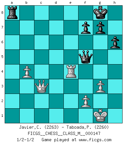 Last move : 1/2-1/2 2025 March 30 23:38:55 [Event "FICGS__CHESS__CLASS_M__000147"] [Site "FICGS"] [Date "2024.11.29"] [Round "1"] [White "Javier,Christian"] [Black "Taboada,Pedro Pablo"] [Result "1/2-1/2"] [WhiteElo "2263"] [BlackElo "2260"] 1.Nc3 Nf6 2.e4 e5 3.Nf3 Nc6 4.d4 exd4 5.Nxd4 Bb4 6.Nxc6 bxc6 7.Bd3 d5 8.exd5 O-O 9.O-O cxd5 10.h3 c6 11.Qf3 Re8 12.Bf4 Bd6 13.Rfe1 Be6 14.Ne2 Qb8 15.b3 Bd7 16.Be3 a5 17.Rab1 Ne4 18.c4 Re6 19.Rbd1 a4 20.cxd5 cxd5 21.Nf4 Rf6 22.Bxe4 Bxf4 23.Bxf4 Rxf4 24.Qc3 Rxe4 25.Rxe4 dxe4 26.Rxd7 axb3 27.axb3 h6 28.b4 Qf4 29.g3 Qf5 30.Rd4 Qxh3 31.Rxe4 Qf5 1/2-1/2 Follow this game move after move (download)We don't really know how the game was invented, though there are suspicions. As soon as we discover the culprits, we'll let you know. (Bruce Pandolfini) Die Jungen erwarten, dass Opa einfach umfällt. Dann aber kann Opa fünf Stunden lang Schach spielen und die jungen Gegner an die Wand drücken. (Viktor Kortschnoi) En posiciones complicadas, Bobby Fischer pocas veces tuvo que temer de cualquiera. (Paul Keres) Le temps de noter son nom sur la feuille de partie, j'étais déjà en zeitnot ! D'un modeste amateur apparié lors de la première ronde d'un open contre le grand-maître Azmaïparashvili. I don't diet. I just don't eat as much as I'd like to. (Linda Evangelista, supermodel)