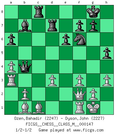 Last move : 1/2-1/2 2025 April 12 17:55:40 [Event "FICGS__CHESS__CLASS_M__000147"] [Site "FICGS"] [Date "2024.11.29"] [Round "1"] [White "Ozen,Bahadir"] [Black "Dyson,John"] [Result "1/2-1/2"] [WhiteElo "2247"] [BlackElo "2227"] 1.e4 c6 2.Nf3 d5 3.Nc3 dxe4 4.Nxe4 Nf6 5.Qe2 Nxe4 6.Qxe4 Nd7 7.Bc4 Nf6 8.Ne5 e6 9.Qe2 b5 10.Bd3 Qc7 11.a4 Bd6 12.Nxc6 b4 13.Nd4 a6 14.Nf5 Bb7 15.Nxd6+ Qxd6 16.O-O h5 17.Qe3 Rd8 18.f3 b3 19.Ra3 bxc2 20.Bxc2 Rc8 21.Bb1 O-O 22.d3 Rfd8 23.Qf2 Qb4 24.Qd2 Qd4+ 25.Qf2 Qb4 26.h3 Rd7 27.Qd2 Qd4+ 28.Qf2 Qb4 29.Qe1 Qd4+ 30.Qf2 Qb4 1/2-1/2 Follow this game move after move (download)First-class players lose to second-class players because second-class players sometimes play a first-class game. (Siegbert Tarrasch) Schach ist ein schwarz-weisser Dschungel. (Garry Kasparov) El ganador de una partida es aquel jugador que hace el penúltimo error. (Savielly Tartakover) Les sacrifices démontrent seulement que quelqu'un a gaffé. (Savielly Tartacover) Life is pleasant. Death is peaceful. It's the transition that's troublesome. (Isaac Asimov)