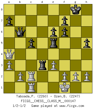 Last move : 1/2-1/2 2025 January 29 16:28:45 [Event "FICGS__CHESS__CLASS_M__000147"] [Site "FICGS"] [Date "2024.11.29"] [Round "1"] [White "Taboada,Pedro Pablo"] [Black "Ozen,Bahadir"] [Result "1/2-1/2"] [WhiteElo "2260"] [BlackElo "2247"] 1.d4 Nf6 2.c4 e6 3.Nc3 Bb4 4.Qc2 O-O 5.a3 Bxc3+ 6.Qxc3 d5 7.Nf3 dxc4 8.Qxc4 b6 9.Bg5 Ba6 10.Qa4 h6 11.Bh4 c5 12.dxc5 bxc5 13.Rd1 Qb6 14.Bxf6 gxf6 15.e3 Bxf1 16.Kxf1 Nc6 17.Rb1 Rad8 18.Ke2 Rd5 19.Rhc1 Ne5 20.Nxe5 Rxe5 21.Rc2 Rd8 22.Kf1 Rd3 23.Rbc1 h5 1/2-1/2 Follow this game move after move (download)Do you realize Fischer almost never has any bad pieces? He exchanges them, and the bad pieces remain with his opponents. (Yuri Balashov) Meine Liebe ist Schach, Schach, Schach. Ich muss jeden Tag Schach spielen, deshalb fühle ich mich so stark. (Miguel Najdorf) No soy una persona materialista y por eso, no resiento la falta o pérdida del dinero. La ausencia de cosas mundanas carece de importancia. Ya que el Ajedrez es una forma en la que puedo ser tan materialista como yo desee sin tener la necesidad de vender mi alma. (Jamie Walter Adams) On n'a jamais que l'âge auquel on a commence à jouer aux échecs car après on cesse de vieillir. (Capablanca) When I took office, only high energy physicists had ever heard of what is called the World Wide Web... Now even my cat has its own page. (Bill Clinton, 1996)