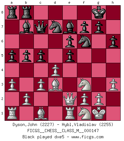 Last move : 0-1 2025 July 24 6:43:56 [Event "FICGS__CHESS__CLASS_M__000147"] [Site "FICGS"] [Date "2024.11.29"] [Round "1"] [White "Dyson,John"] [Black "Hybl,Vladislav"] [Result "0-1"] [WhiteElo "2227"] [BlackElo "2255"] 1.e4 c5 2.Nf3 d6 3.Bb5+ Nd7 4.c3 Ngf6 5.Qe2 a6 6.Ba4 b5 7.Bc2 e6 8.d4 Bb7 9.O-O Be7 10.Re1 O-O 11.Nbd2 Qc7 12.Bd3 Rfc8 13.h3 h6 14.a3 Rcb8 15.Nf1 a5 16.e5 dxe5 17.dxe5 c4 18.Bc2 Bxf3 19.gxf3 Nd5 20.Qe4 Bc5 0-1 This chess game has been lost on time (started : 2024.11.29 5:15:31) Follow this game move after move (download)My opponents make good moves too. Sometimes I don't take these things into consideration. (Bobby Fischer) Wie gewinnt Tal? Er entwickelt alle seine Figuren in die Brettmitte und opfert sie dann irgendwo. (Robert James Fischer) En un gambito tu regalas un Peón por el bién de tomar un juego perdido. (Samuel Standige Boden) Je menace de comprendre la position. (Anonyme) Faith : not wanting to know what is true. (Friedrich Nietzsche)