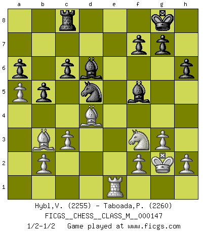 Last move : 1/2-1/2 2025 April 10 17:35:57 [Event "FICGS__CHESS__CLASS_M__000147"] [Site "FICGS"] [Date "2024.11.29"] [Round "1"] [White "Hybl,Vladislav"] [Black "Taboada,Pedro Pablo"] [Result "1/2-1/2"] [WhiteElo "2255"] [BlackElo "2260"] 1.e4 e5 2.Nf3 Nc6 3.Bb5 a6 4.Ba4 Nf6 5.O-O Be7 6.Re1 b5 7.Bb3 O-O 8.c3 d5 9.exd5 Nxd5 10.Nxe5 Nxe5 11.Rxe5 c6 12.d3 Bd6 13.Re1 Bf5 14.Qf3 Qh4 15.g3 Qh3 16.Be3 Bxd3 17.Nd2 Qf5 18.Bd4 Rfe8 19.a4 h6 20.Kg2 Rxe1 21.Rxe1 Qxf3+ 22.Nxf3 Bf5 23.a5 Rc8 1/2-1/2 Follow this game move after move (download)A passed Pawn increases in strength as the number of pieces on the board diminishes. (Capablanca) Obwohl ich vom Stil her kaum zu den Priestern der Schachkunst gezählt werde, halte ich Schach doch für eine Kunst. (Tigran Petrosjan) Nunca nadie ha ganado una partida de Ajedrez rindiendose. (Unknown) Aucun coup ne doit être joué sans but. (Pedro Damiano) An expert is a man who has made all the mistakes which can be made in a very narrow field. (Niels Bohr)