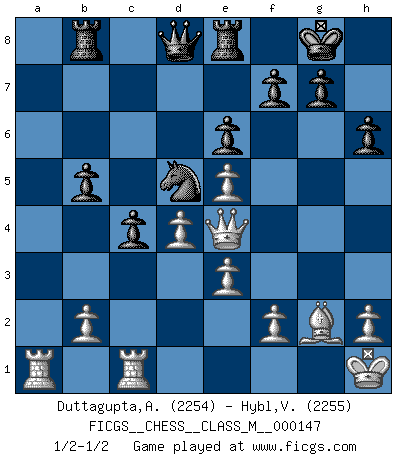 Last move : 1/2-1/2 2025 May 9 9:40:18 [Event "FICGS__CHESS__CLASS_M__000147"] [Site "FICGS"] [Date "2024.11.29"] [Round "1"] [White "Duttagupta,Aniruddha"] [Black "Hybl,Vladislav"] [Result "1/2-1/2"] [WhiteElo "2254"] [BlackElo "2255"] 1.d4 Nf6 2.c4 e6 3.Nf3 d5 4.g3 Be7 5.Bg2 O-O 6.O-O dxc4 7.Qc2 a6 8.Qxc4 b5 9.Qc2 Bb7 10.Bd2 h6 11.Rc1 Bd6 12.a3 Re8 13.Bf4 Nbd7 14.Nbd2 Nd5 15.e3 Nxf4 16.gxf4 c5 17.Ne4 Bxe4 18.Qxe4 c4 19.a4 Rb8 20.Ne5 Bxe5 21.fxe5 Nb6 22.axb5 axb5 23.Kh1 Nd5 1/2-1/2 Follow this game move after move (download)When asked, -How is that you pick better moves than your opponents?, I responded: I'm very glad you asked me that, because, as it happens, there is a very simple answer. I think up my own moves, and I make my opponent think up his. (Alexander Alekhine) Kasparov stellt für gewöhnlich die Regeln auf und bricht sie dann selbst wieder. (Alexej Shirov) Al jugar al Ajedrez entonces, podemos aprender: Primero: Previsión... Segundo: Prudencia... Tercero: Cautela... Y al final, aprendemos del Ajedrez el hábito de no ser desanimados por apariencias malas presentes en el estado de nuestros asuntos, el hábito de la esperanza por una oportunidad favorable y la perseveración de los secretos de los recursos. (Benjamin Franklin) Le joueur d'Echecs qui veut atteindre le top est obligé de développer son propre credo créatif. Alexeï Stepanovicth Souétine. Il est facile d'écrire des livres ! Ce qui est difficile, c'est de jouer ! (Alexeï Stepanovicth Souétine) I live to kill Traxler counterattack. (Ilmars Cirulis)