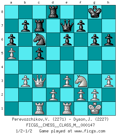 Last move : 1/2-1/2 2025 May 12 21:11:30 [Event "FICGS__CHESS__CLASS_M__000147"] [Site "FICGS"] [Date "2024.11.29"] [Round "1"] [White "Perevozchikov,Vjacheslav"] [Black "Dyson,John"] [Result "1/2-1/2"] [WhiteElo "2271"] [BlackElo "2227"] 1.b3 d5 2.Bb2 c5 3.e3 Nf6 4.Nf3 g6 5.c4 dxc4 6.Bxc4 Bg7 7.O-O Nc6 8.Ne5 Nxe5 9.Bxe5 O-O 10.Nc3 Bd7 11.Qc2 Bc6 12.a4 e6 13.Bb5 Rc8 14.Bxc6 Rxc6 15.Qb2 Qe7 16.Rac1 Rd8 17.Nb5 a6 18.Na3 Ne8 19.Bxg7 Nxg7 20.Nc4 Ne8 21.h3 Rc7 22.a5 Nf6 23.Ne5 Nd7 24.Nf3 Nb8 25.Qc3 h6 26.Rfe1 Nc6 1/2-1/2 Follow this game move after move (download)Bobby is the finest Chess player this country ever produced. His memory for the moves, his brilliance in dreaming up combinations, and his fierce determination to win are uncanny. (John Collins) Schon mancher Spieler hat aufgegeben, um zu vermeiden, daß er eine Figur verliert. (Savielly Grigorievitsch Tartakower) Yo jugué Ajedrez con el y a veces le pude haber ganado solo que siempre devuelve su última jugada y juega la partida de manera diferente. (Mark Twain) Les erreurs sont comme les malheurs, elles n'arrivent jamais seules. (Siegbert Tarrasch) To err is human, to shift the blame on someone else is tactical. (Mladen Jankovic)