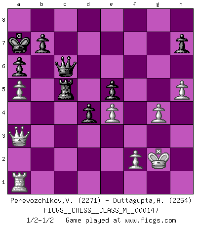 Last move : 1/2-1/2 2025 February 19 15:56:50 [Event "FICGS__CHESS__CLASS_M__000147"] [Site "FICGS"] [Date "2024.11.29"] [Round "1"] [White "Perevozchikov,Vjacheslav"] [Black "Duttagupta,Aniruddha"] [Result "1/2-1/2"] [WhiteElo "2271"] [BlackElo "2254"] 1.d3 d5 2.Nf3 Nf6 3.g3 c5 4.Bg2 Nc6 5.O-O e5 6.e4 d4 7.a4 Bg4 8.h3 Bh5 9.Bg5 Be7 10.Bd2 a6 11.Na3 Nd7 12.Qe1 f6 13.Nc4 Qc7 14.a5 O-O-O 15.Qb1 Kb8 16.c3 g5 17.Rc1 Rhe8 18.cxd4 exd4 19.b4 cxb4 20.e5 fxe5 21.Nxg5 Nc5 22.Ne4 Nxe4 23.Bxe4 Rf8 24.Bh6 Rf6 25.Bg5 Re6 26.Bd2 Rf8 27.Nb6 Bf3 28.Rxc6 Rxc6 29.Nd5 Qd7 30.Nxe7 Bxe4 31.dxe4 Qxe7 32.Bxb4 Rc5 33.Qb3 Rfc8 34.Qa3 R8c6 35.Bxc5 Rxc5 36.h4 Qd6 37.Kg2 Qc7 38.h5 Ka7 39.g4 Qc6 1/2-1/2 Follow this game move after move (download)For me, Chess is life and every game is like a new life. Every Chess player gets to live many lives in one lifetime. (Eduard Gufeld) Wir können eben der zündenden Macht des Opfers nicht wiederstehen, denn die Begeisterung für das Opfer liegt in der Natur des Menschen. (Rudolf Spielmann) Evita las multitudes. Haz independientemente tu propio razonamiento. Trata de ser el jugador de Ajedrez, no la pieza de Ajedrez. (Ralph Charell) Demandez au pauvre Cg1 ce qu'il en pense. Eduard Gufeld à propos de la variante Saemisch de l'Est-Indienne. Every now and then a man's mind is stretched by a new idea and never shrinks back to its former dimensions. (Oliver Wendell Holmes, Sr.)