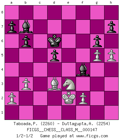 Last move : 1/2-1/2 2025 April 20 7:35:27 [Event "FICGS__CHESS__CLASS_M__000147"] [Site "FICGS"] [Date "2024.11.29"] [Round "1"] [White "Taboada,Pedro Pablo"] [Black "Duttagupta,Aniruddha"] [Result "1/2-1/2"] [WhiteElo "2260"] [BlackElo "2254"] 1.d4 d5 2.c4 e6 3.Nf3 Nf6 4.g3 Bb4+ 5.Bd2 Be7 6.Bg2 O-O 7.O-O c6 8.Qc2 Nbd7 9.Bf4 b6 10.Nbd2 Nh5 11.e3 Bb7 12.cxd5 Nxf4 13.exf4 cxd5 14.Rfc1 Nf6 15.Ne5 Qd6 16.Ndc4 Qc7 17.Ne3 Qxc2 18.Rxc2 Rfc8 19.Rac1 g6 20.Rxc8+ Bxc8 21.g4 Kf8 22.Bf1 Ne4 23.Rc2 Nd6 24.Bd3 Bb7 25.Kf1 f6 26.Rc7 fxe5 27.fxe5 Rc8 28.exd6 Rxc7 29.dxc7 Bd6 30.h4 Bxc7 31.Ke2 e5 32.dxe5 Bxe5 33.b3 Ke7 34.g5 Kd6 35.h5 Bf4 1/2-1/2 Follow this game move after move (download)Chess is a forcing house where the fruits of character can ripen more fully than in life. (Edward Morgan Foster) Im Fernschach kannst du während dem Spiel rauchen. (John Christen Knudsen) Es muy difícil jugar en contra de la teoría de Einstein. - en su primera derrota en contra de Fischer (Mikhail Tal) Les réformistes prétendent que les progrès de la théorie conduiront à la disparition des échecs, et qu'il faut, pour leur rendre vie, en remanier les règles. En réalité, qu'exprime cette affirmation? Le mépris de l'intuition, de l'imagination et de tous les autres éléments qui font des échecs un art. (Alexander Alekhine) This is where the fun begins. (Anakin Skywalker in Star Wars ep.3)