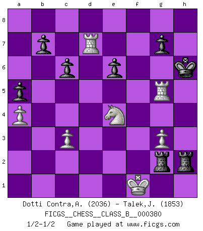 Last move : 1/2-1/2 2025 April 15 1:22:23 [Event "FICGS__CHESS__CLASS_B__000380"] [Site "FICGS"] [Date "2024.11.29"] [Round "1"] [White "Dotti Contra,Alessandro"] [Black "Talek,Jan"] [Result "1/2-1/2"] [WhiteElo "2036"] [BlackElo "1853"] 1.e4 Nc6 2.Nf3 e5 3.Bc4 Bc5 4.d3 Nf6 5.O-O d6 6.Nc3 a6 7.Bg5 h6 8.Bxf6 Qxf6 9.Nd5 Qd8 10.c3 Ba7 11.a4 O-O 12.Bb3 a5 13.Qe2 Be6 14.Bc4 Ne7 15.d4 exd4 16.Nxe7+ Qxe7 17.Bxe6 fxe6 18.Nxd4 Rf7 19.g3 Raf8 20.Rad1 Qd7 21.Qg4 Rf6 22.e5 dxe5 23.Nb5 Qf7 24.Nxa7 Rxf2 25.Rfe1 h5 26.Qe4 h4 27.Qxh4 Rxb2 28.Rf1 Rf2 29.Rfe1 Rb2 30.Rf1 Rf2 31.Rfe1 Qf3 32.Qh3 Rc2 33.Nb5 Qf2+ 34.Kh1 Qf3+ 35.Kg1 Rf6 36.Rd8+ Kf7 37.Rd7+ Kg8 38.Rd8+ Kf7 39.Rd7+ Kg6 40.Qf1 Qf2+ 41.Qxf2 R6xf2 42.Rxe5 Rg2+ 43.Kf1 Rcf2+ 44.Ke1 Kf6 45.Rh5 Ra2 46.Kf1 Raf2+ 47.Ke1 Ra2 48.Kf1 c6 49.Nd6 Raf2+ 50.Ke1 Re2+ 51.Kf1 Ref2+ 52.Ke1 Ra2 53.Ne4+ Kg6 54.Rg5+ Kh6 55.Kf1 Rxh2 56.Kg1 Rag2+ 57.Kf1 Ra2 58.Kg1 Rag2+ 59.Kf1 1/2-1/2 Follow this game move after move (download)Chess problems demand from the composer the same virtues that characterize all worthwhile art: originality, invention, conciseness, harmony, complexity, and splendid insincerity. (Vladimir Nabokov) Jeder weiß, dass Gasprom Putins persönliches Machtinstrument ist. Die Firma wird vom Kreml aus geleitet und wird schon deshalb nie transparent sein. (Garry Kasparov) Las Aperturas te enseñan aperturas. ¡Los Finales te enseñan Ajedrez!. (Stephan Gerzadowicz) Les Echecs ont trois composantes : le temps, l'espace et le matériel en dernier. (Mikhail Tal) You must have a dream in order to have it come true. (A.P.J. Kalam)