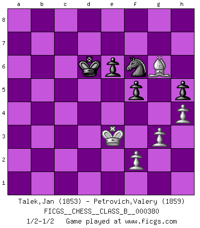 Last move : 1/2-1/2 2025 March 30 23:54:3 [Event "FICGS__CHESS__CLASS_B__000380"] [Site "FICGS"] [Date "2024.11.29"] [Round "1"] [White "Talek,Jan"] [Black "Petrovich,Valery"] [Result "1/2-1/2"] [WhiteElo "1853"] [BlackElo "1859"] 1.Na3 d5 2.Nf3 c5 3.e3 Nf6 4.d4 Nc6 5.Be2 cxd4 6.exd4 Bf5 7.c4 g6 8.O-O Bg7 9.Qb3 Qb6 10.Qxb6 axb6 11.Nb5 O-O 12.b3 Be4 13.Nc7 Rad8 14.Nb5 Ne8 15.Bf4 dxc4 16.bxc4 Bxf3 17.Bxf3 Nxd4 18.Nxd4 Rxd4 19.Bg5 Bf6 20.Bh6 Ng7 21.Rab1 Rxc4 22.Rfd1 Rb8 23.Rxb6 Nf5 24.Rxb7 Rbc8 25.Bd2 Rd8 26.R7b1 Rc2 27.Be1 Rxd1 28.Rxd1 Rxa2 29.g3 Kg7 30.h4 Be5 31.Be4 e6 32.Kf1 Nh6 33.Bd3 Nf5 34.Rc1 Ne7 35.Rc5 Ra3 36.Bc2 Nd5 37.Be4 Bd6 38.Ra5 Rxa5 39.Bxa5 Bf8 40.Bd2 Be7 41.Bc1 Bf6 42.Be3 Bb2 43.Kg2 h6 44.Bd2 Ba3 45.Be3 Bd6 46.Bd4+ f6 47.Bd3 Ne7 48.Be2 Nf5 49.Bc3 Kf7 50.Be1 Nd4 51.Ba6 Nf5 52.Bd2 h5 53.Bc4 Ne7 54.Be3 f5 55.Bb5 Bb4 56.Bc4 Ba5 57.Kf3 Bc7 58.Bb5 Nd5 59.Bc4 Be5 60.Kg2 Ke7 61.Bc5+ Kd7 62.Bb5+ Kc7 63.Be8 Bd6 64.Bxd6+ Kxd6 65.Bxg6 Nf6 66.Kf3 Ke7 67.Ke3 Kd6 1/2-1/2 Follow this game move after move (download)Chess is a more highly symbolic game, but the aggressions are therefore even more frankly represented in the play. It probably began as a war game; that is, the representation of a miniature battle between the forces of two kingdoms. (Karl Meninger) Sie bekommen vielleicht den Eindruck, dass die Spitzenspieler überhaupt gar nicht so stark sind. Aber das stimmt nicht. Es ist eine Illusion. Mit einem Computer an der Seite ist es sehr leicht, Urteile zu fällen, aber wenn man alleine am Brett sitzt, sieht die Sache ganz anders aus. (Vladimir Kramnik) El Ajedrez es despiadado: debes de estar preparado para matar gente. (Nigel Short) 'L'échange des dames est un coup dur pour les deux adversaires...' Un journaliste lors d'une partie du match Spassky-Fischer Empty your mind, be formless, shapeless — like water. (Bruce Lee)