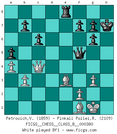 Last move : 1-0 2025 November 16 14:13:42 [Event "FICGS__CHESS__CLASS_B__000380"] [Site "FICGS"] [Date "2024.11.29"] [Round "1"] [White "Petrovich,Valery"] [Black "Pinkall Pollei,Rich"] [Result "1-0"] [WhiteElo "1859"] [BlackElo "2109"] 1.Nf3 d5 2.g3 Nf6 3.Bg2 c6 4.c4 Bf5 5.O-O e6 6.Qb3 Qb6 7.d3 Nbd7 8.cxd5 exd5 9.Qc2 Be7 10.Nc3 O-O 11.e4 dxe4 12.dxe4 Bg6 13.Nh4 Rfe8 14.h3 Bb4 15.Be3 Qa5 16.Bd2 Qe5 17.Rad1 Rad8 18.a3 Bxc3 19.Nxg6 hxg6 20.Bxc3 Qe6 21.Rd3 Nb6 22.Rfd1 Rxd3 23.Rxd3 Nbd7 24.Bb4 Qe5 25.a4 a5 26.Bd6 Qe6 27.Bf4 Qe7 28.b3 Nxe4 29.Rxd7 Qxd7 30.Bxe4 Qxh3 31.Qc4 Kh8 32.Be3 Kh7 33.Bg2 Qf5 34.Bf1 Re4 35.Qc3 Qd5 36.Bc4 Qd1+ 37.Kg2 b5 38.Qd3 Qxd3 39.Bxd3 Rb4 40.Bc2 bxa4 41.bxa4 Rb2 42.Be4 c5 43.Bd3 Ra2 44.Bb5 Rc2 45.Kf3 f5 46.Kf4 Kh6 47.Bc6 Kh5 48.Bf3+ Kh6 49.Ke5 Kh7 50.Bc6 Kg8 51.Kd5 c4 52.Bb5 g5 53.Bxc4 Kf7 54.Kc5 Kf6 55.Bd4+ Ke7 56.Kb5 Ke8 57.Be6 Rd2 58.Bc5 Rb2+ 59.Kxa5 g6 60.Ka6 Kd8 61.Bb6+ Ke7 62.Bc8 f4 63.g4 Kd6 64.f3 Rd2 65.Bb7 Kd7 66.Ka7 Rd6 67.a5 Rd1 68.a6 Rd6 69.Be4 Kc8 70.Bc5 Re6 71.Bd5 Re1 72.Kb6 Kd7 73.Be4 Re2 74.Bc6+ Kc8 75.Bd4 Re7 76.Bb7+ Kd7 77.a7 1-0 Follow this game move after move (download)Why must I lose to this idiot ? (Aron Nimzovich) Du musst Deinen Gegner in einen tiefen dunklen Wald führen wo 2+2=5 ist und wo der Weg, der wieder hinausführt, nur breit genug für einen ist. (Mikhail Nekhemyevich Tal) El Ajedrez es como la guerra en un tablero. (Bobby Fischer) Si le désir cupide (et stupide) de gagner est une inépuisable source de souffrance, une combinaison brillante sur l'échiquier est une découverte : le coquelicot qui s'épanouit lorsque apparaît la Voie Lactée. (Arrabal) Big Chess is a place for big hallucinations. (Thibault de Vassal)