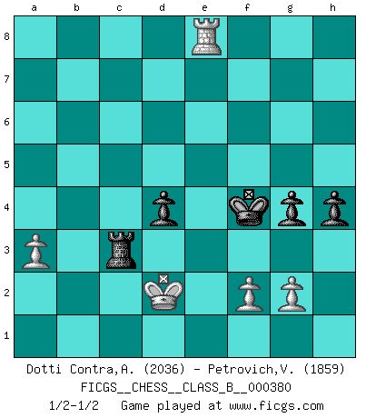 Last move : 1/2-1/2 2025 April 12 22:43:59 [Event "FICGS__CHESS__CLASS_B__000380"] [Site "FICGS"] [Date "2024.11.29"] [Round "1"] [White "Dotti Contra,Alessandro"] [Black "Petrovich,Valery"] [Result "1/2-1/2"] [WhiteElo "2036"] [BlackElo "1859"] 1.e4 c5 2.Nf3 g6 3.d4 cxd4 4.Nxd4 Nc6 5.Be3 Nf6 6.Nc3 Bg7 7.Bc4 O-O 8.O-O d6 9.h3 Nxe4 10.Nxe4 d5 11.Nxc6 bxc6 12.Bd3 dxe4 13.Bxe4 Ba6 14.Qxd8 Rfxd8 15.Rfd1 Bxb2 16.Rab1 Rxd1+ 17.Rxd1 Ba3 18.Bxc6 Rc8 19.Be4 Bc4 20.Rd7 a6 21.Bb7 Rb8 22.Bf4 Bd6 23.Bxd6 exd6 24.a3 Be6 25.Re7 Kg7 26.Rc7 a5 27.Kf1 g5 28.Ke2 h5 29.Bf3 h4 30.Ra7 Rb5 31.Ra6 Rc5 32.Kd2 d5 33.c3 Kf6 34.Be2 Ke5 35.Bd3 d4 36.c4 f6 37.Ra8 Bc8 38.Ra7 Be6 39.Ra8 Bxc4 40.Bxc4 Rxc4 41.Rxa5+ Ke4 42.Ra6 Ke5 43.Ra5+ Kf4 44.Ra6 f5 45.Ra5 Rc3 46.Ra4 Ke4 47.Ra8 Rb3 48.Kc2 Rc3+ 49.Kd2 g4 50.hxg4 fxg4 51.Re8+ Kf4 1/2-1/2 Follow this game move after move (download)What would Chess be without silly mistakes ? (Kurt Richter) Es hat in meinem Leben Zeiten gegeben, da ich sehr nahe daran war zu glauben, daß ich auch nicht eine einzige Schachpartie verlieren könnte. (José Raúl Capablanca) En posiciones complicadas, Bobby Fischer pocas veces tuvo que temer de cualquiera. (Paul Keres) Vous n'êtes pas toujours obligé de jouer le meilleur coup. Un coup doit être actif, entreprenant, correct et beau ! (David Bronstein) All men can see these tactics whereby I conquer, but what none can see is the strategy out of which victory is evolved. (Sun Tzu)