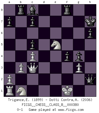 Last move : 0-1 2025 February 21 17:12:24 [Event "FICGS__CHESS__CLASS_B__000380"] [Site "FICGS"] [Date "2024.11.29"] [Round "1"] [White "Trigance,Emile"] [Black "Dotti Contra,Alessandro"] [Result "0-1"] [WhiteElo "1899"] [BlackElo "2036"] 1.e4 e5 2.Nf3 Nc6 3.Bb5 Nf6 4.O-O Bc5 5.c3 O-O 6.d4 Bb6 7.Bg5 d6 8.Bxc6 bxc6 9.h3 h6 10.Bh4 g5 11.Bg3 Nxe4 12.Bh2 f5 13.dxe5 dxe5 14.Qb3+ Kh7 15.Nxe5 g4 16.c4 Qh4 17.g3 Qxh3 18.Qd3 Nxf2 19.Rxf2 Bxf2+ 20.Kxf2 Qxh2+ 21.Kf1 Rb8 22.b3 c5 23.Qc3 f4 0-1 Follow this game move after move (download)When you are lonely, when you feel yourself an alien in the world, play Chess. This will raise your spirits and be your counselor in war. (Aristotle) Wie bekannt hörte Morphy 1859 auf, Schach zu spielen. Seine Enttäuschung galt nicht so sehr dem Schach, wie den Schachspielern. (Robert James Fischer) Aquel que teme a un Peón de Reina aislado, debería de retirarse del Ajedrez. (Siegbert Tarrasch) Mais n'est-ce pas déjà le limiter injurieusement que d'appeler les échecs un jeu? N'est-ce pas aussi une science, un art, ou quelque chose qui, comme le cercueil de Mahomet entre ciel et terre, est suspendu entre l'un et l'autre, et qui réunit un nombre incroyable de contraires ? (Stefan Zweig) After growing wildly for years, the field of computing appears to be reaching its infancy. (John Pierce)