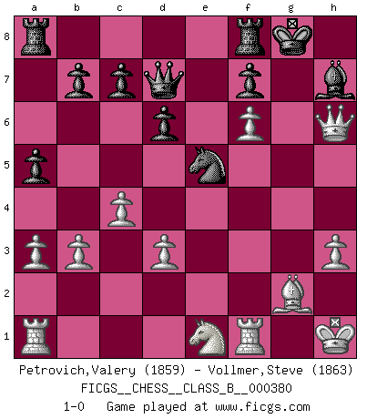 Last move : 1-0 2025 January 4 10:39:30 [Event "FICGS__CHESS__CLASS_B__000380"] [Site "FICGS"] [Date "2024.11.29"] [Round "1"] [White "Petrovich,Valery"] [Black "Vollmer,Steve"] [Result "1-0"] [WhiteElo "1859"] [BlackElo "1863"] 1.c4 e5 2.Nc3 Nf6 3.Nf3 Nc6 4.g3 Bc5 5.Bg2 O-O 6.d3 h6 7.O-O d6 8.a3 a5 9.e3 Bf5 10.b3 Qd7 11.Nh4 Bh7 12.Kh1 g5 13.Nf3 Qf5 14.Ne1 h5 15.f4 gxf4 16.gxf4 Qd7 17.fxe5 Ng4 18.h3 Nxe3 19.Bxe3 Bxe3 20.Nd5 Bg5 21.Qxh5 Be7 22.Nf6+ Bxf6 23.exf6 Ne5 24.Qh6 1-0 Follow this game move after move (download)It was clear to me that the vulnerable point of the American Grandmaster (Bobby Fischer) was in double-edged, hanging, irrational positions, where he often failed to find a win even in a won position. (Efim Geller) Wenn du auf das Glück wartest, wird das Leben ziemlich langweilig. (Mikhail Nekhemyevich Tal) El Ajedrez expande y enriquece tu mente. (Saudin Robovic) Demandez au pauvre Cg1 ce qu'il en pense. Eduard Gufeld à propos de la variante Saemisch de l'Est-Indienne. Life is painting a picture, not doing a sum. (Oliver Wendell Holmes, Jr.)
