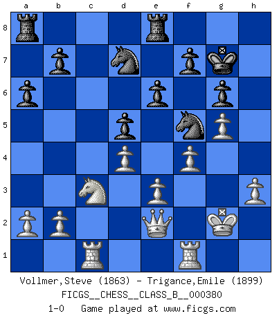 Last move : 1-0 2025 January 24 8:30:57 [Event "FICGS__CHESS__CLASS_B__000380"] [Site "FICGS"] [Date "2024.11.29"] [Round "1"] [White "Vollmer,Steve"] [Black "Trigance,Emile"] [Result "1-0"] [WhiteElo "1863"] [BlackElo "1899"] 1.d4 d5 2.c4 c6 3.cxd5 cxd5 4.Nf3 Nf6 5.Nc3 Nc6 6.Bf4 Bf5 7.e3 e6 8.Bd3 Bg4 9.O-O a6 10.h3 Bxf3 11.Qxf3 Bd6 12.Rac1 Bxf4 13.Qxf4 O-O 14.Qh4 Re8 15.f4 Nd7 16.Qxh7+ Kf8 17.Qh5 Qf6 18.Qf3 Ne7 19.g4 g6 20.Kg2 Kg7 21.g5 Qf5 22.Bxf5 Nxf5 23.Qe2 1-0 Follow this game move after move (download)By playing at Chess then, we may learn: First: Foresight... Second: Circumspection... Third: Caution... And lastly, we learn by Chess the habit of not being discouraged by present bad appearances in the state of our affairs, the habit of hoping for a favorable chance, and that of persevering in the secrets of resources. (Benjamin Franklin) Taktik ist was man tun muß, wenn etwas zu tun ist. Strategie ist was man tun muß, wenn nichts zu tun ist. (Savielly Grigorievitsch Tartakower) Peones: ellos son el alma de esta partida, solos forman el ataque y la defensa. (Philidor) RxDa4 pat (...) Wisdom is the reward you get for a lifetime of listening when you'd have preferred to talk. (Doug Larson)
