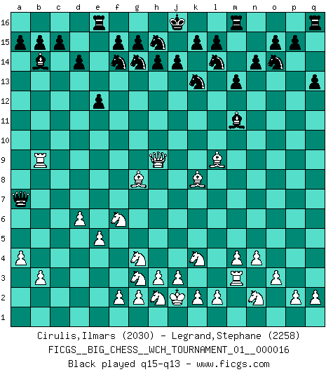 Last move : 0-1 2025 May 3 0:37:51 [Event "FICGS__BIG_CHESS__WCH_TOURNAMENT_01__000016"] [Site "FICGS"] [Date "2024.12.01"] [Round "1"] [White "Cirulis,Ilmars"] [Black "Legrand,Stephane"] [Result "0-1"] [WhiteElo "2030"] [BlackElo "2258"] 1.j2-k4 p16-o14 2.h2-g4 m15-m13 3.e2-e4 e15-e13 4.d2-d4 b16-c14 5.c1-j7 j15-k13 6.n2-n4 l16-p12 7.m2-m4 f16-b12 8.b1-c3 d15-d14 9.f1-b5 c16-l8 10.k1-h2 h16-o10 11.o2-o3 e13-e12 12.o1-g8 n15-n14 13.h1-m5 o16-f8 14.g1-j2 o10-k10 15.e4-e5 e16-e13 16.l1-p5 k10-d10 17.a1-d1 a16-e16 18.p5-l9 g16-f14 19.p1-n2 k16-l14 20.a2-a4 l8-k9 21.b5-d3 k9-d3 22.d1-d3 p12-o13 23.c3-e4 d10-b8 24.d3-b3 b8-a8 25.e4-f6 o13-c2 26.b3-b12 f8-b12 27.b2-b3 b12-c13 28.j7-k8 e13-d13 29.e1-c1 c2-n12 30.d4-d5 c14-e13 31.m5-h9 c13-b14 32.c1-c9 d13-c13 33.c9-a9 a8-b8 34.a9-b9 b8-a7 35.m1-m3 n12-f5 36.b9-a9 a7-d4 37.j2-g3 f5-c2 38.d5-d6 d4-b6 39.a9-b9 b6-a7 40.j1-j2 c2-m11 41.q1-c1 c13-c1 42.k8-c1 e13-g14 43.c1-k8 q15-q13 44.m4-m5 q13-q12 45.q2-q3 q12-q11 46.k4-j6 q16-q12 47.n2-l3 q12-p12 48.p2-p4 m16-q16 0-1 Follow this game move after move (download)One bad move nullifies forty good ones. (Horowitz) Der beste Spieler in einem Turnier gewinnt es nie. Er landet auf Platz zwei oder drei. (Siegbert Tarrasch) Una mala movida nulifica cuarenta buenas. (Horowitz) On entre au jeu d'Echecs comme on entre en Religion. Pour le joueur d'Echecs, la partie d'Echecs c'est l'office, la messe, le défilé du 1er Mai, le dépôt de gerbe au Monument aux Morts. C'est un drame sacré. (Michel Roos) The problem with troubleshooting is that trouble shoots back. (Anonymous)
